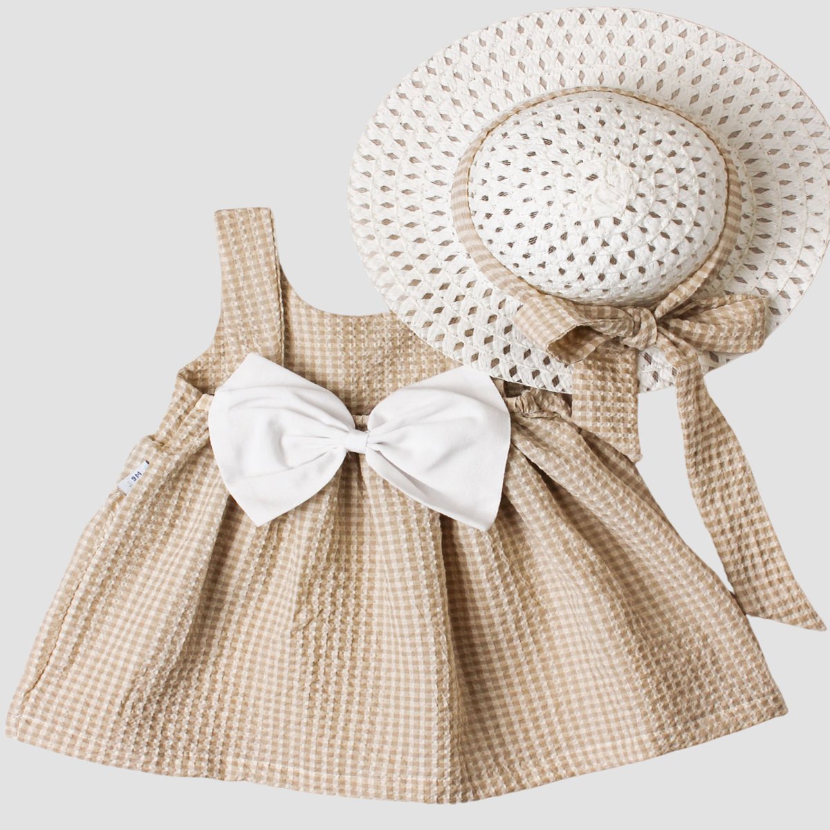 FRESCHISSIMO ABITINO IN COTONE, CON GRANDE FIOCCO NELLA SCHIENA, IN COORDINATO CAPPELLO DI PAGLIA