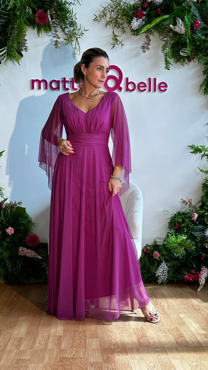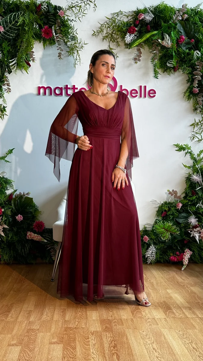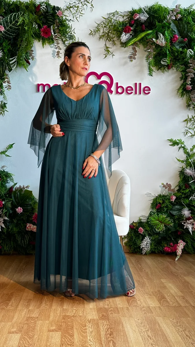 L’abito Diana รจ perfetto per le occasioni speciali. Lungo e con eleganti maniche a mantella, cintura regolabile in vita, รจ ideale per le cerimonie importanti. Renditi unica con questo abito da cerimonia.