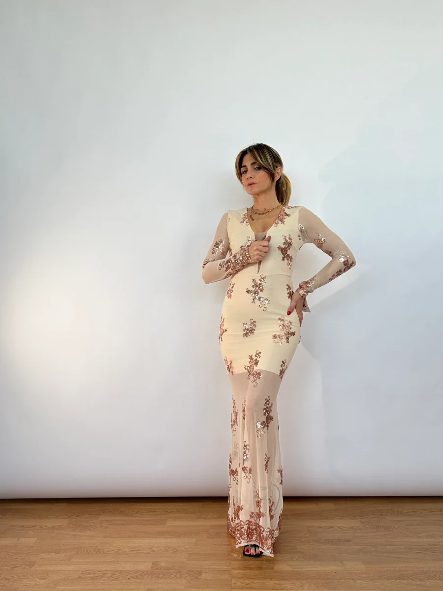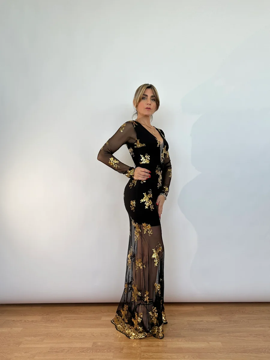 Abito lungo a sirena, in tulle con sottoveste corta,manica lunga scollo ampio con applicazioni di paillettes