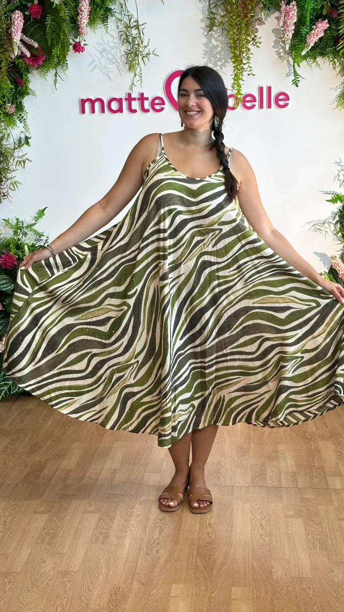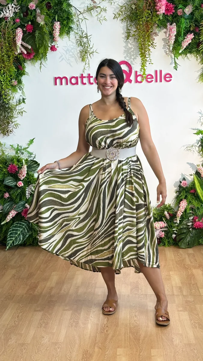 Questo abito misto lino unisce eleganza e audacia con le sue bretelle regolabili che garantiscono una vestibilitร perfetta. La linea svasata valorizza ogni movimento, mentre la fantasia impreziosita da strass aggiunge un tocco di brillantezza irresistibile. Perfetto per chi vuole distinguersi con stile e personalitร . La modella Sara indossa la La tg Large Rosalia indossa […]
