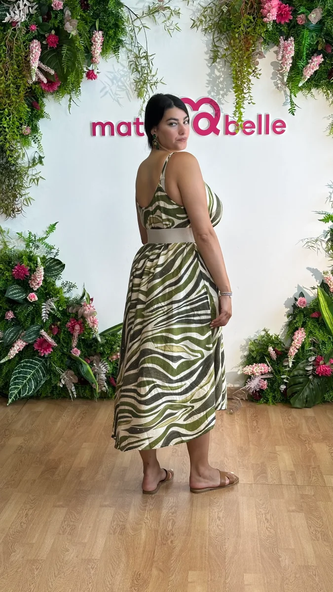 Questo abito misto lino unisce eleganza e audacia con le sue bretelle regolabili che garantiscono una vestibilitร perfetta. La linea svasata valorizza ogni movimento, mentre la fantasia impreziosita da strass aggiunge un tocco di brillantezza irresistibile. Perfetto per chi vuole distinguersi con stile e personalitร .