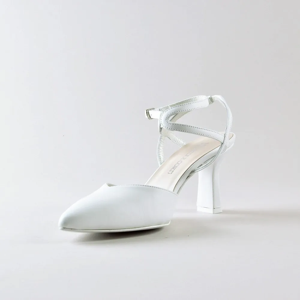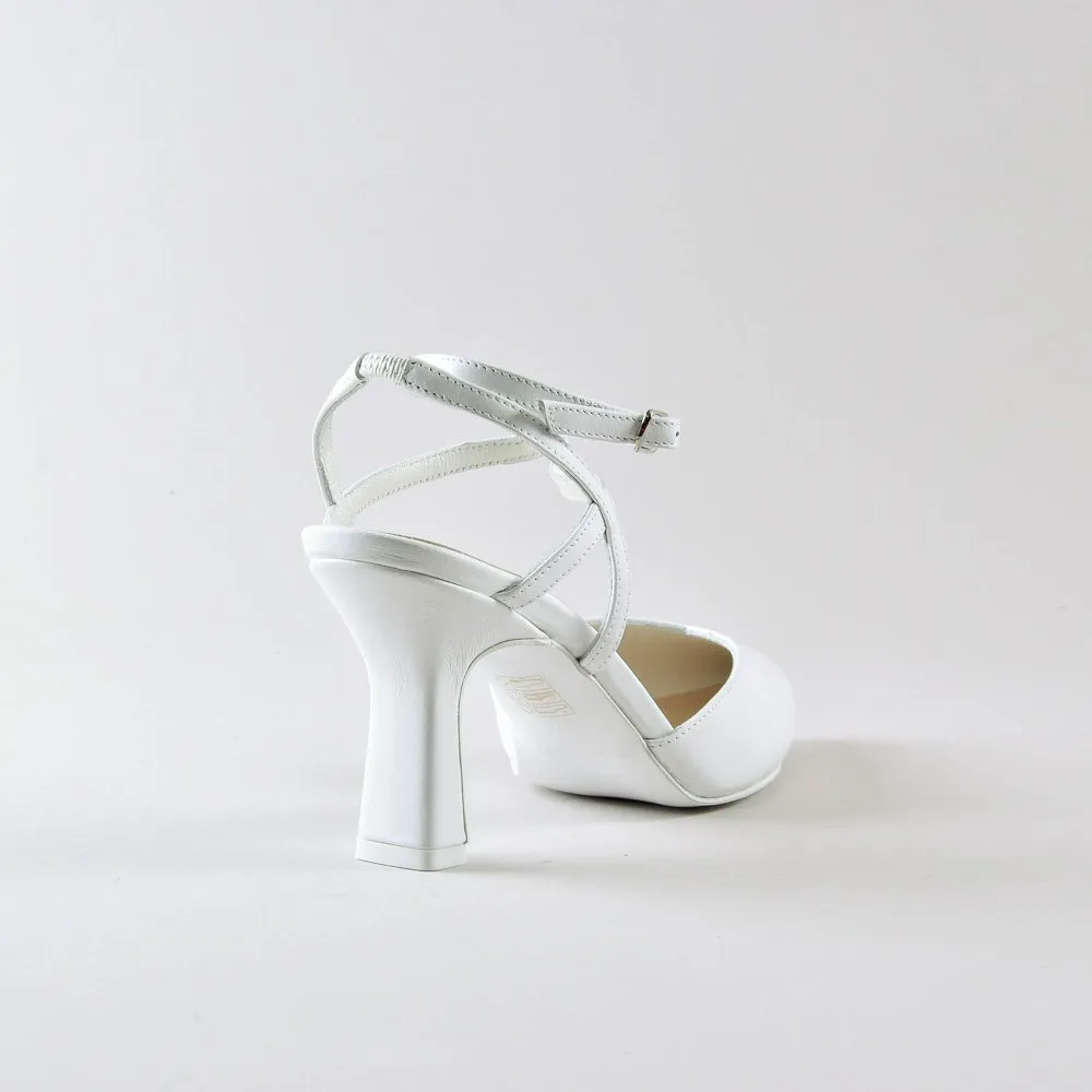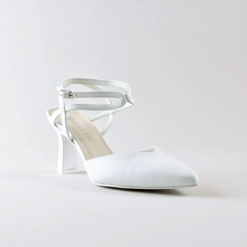 Ankle Strap Madame di NIKI CORTI รจ la scelta ideale per la sposa che desidera combinare eleganza e comfort nel giorno del matrimonio. Realizzate in morbida nappa bianca, queste scarpe presentano un tacco di 70mm con base rettangolare che, visto di lato, appare sottile, offrendo cosรฌ una combinazione di stabilitร e raffinatezza.