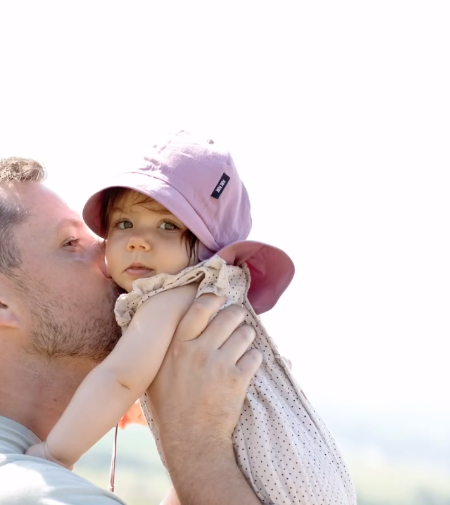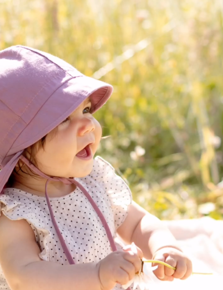 Berretto in morbido cotone con fattore di protetezione UV – Neonato e bambino. Il cappello รจ dotato di due cinturini per evitare che scivoli, di un paracollo per proteggersi dal sole e offre anche una protezione UV alta, pari a 50+ nelle colorazioni rosa e blu e pari a 20+ nella colorazione lilla.