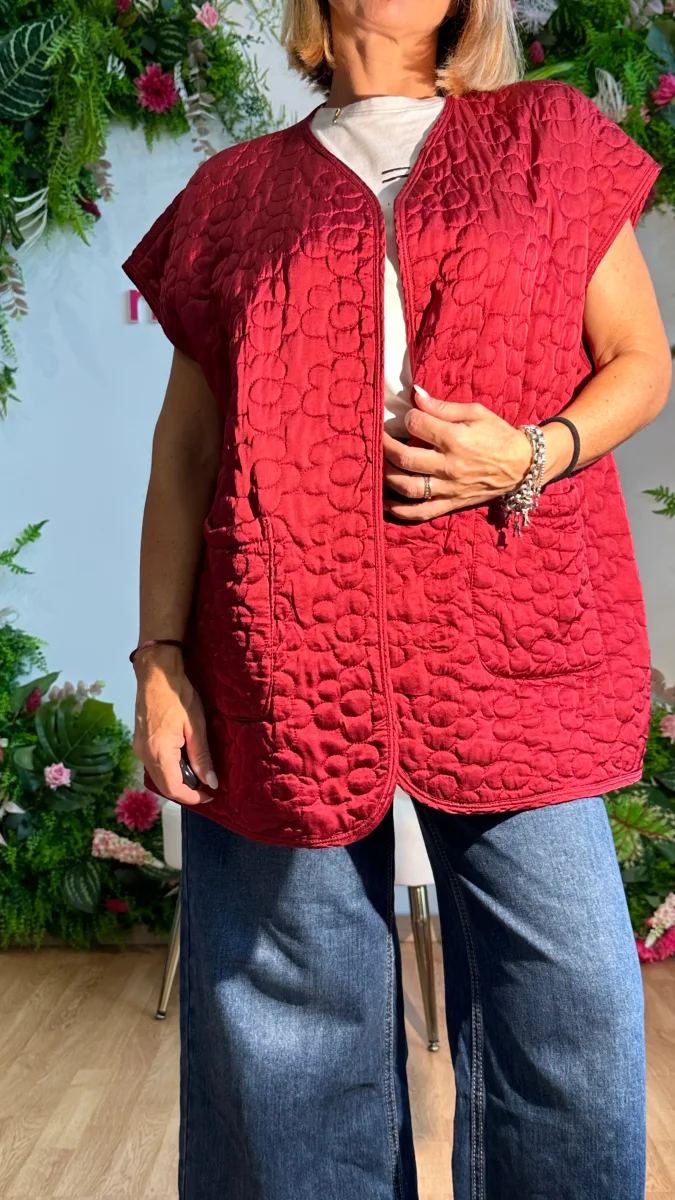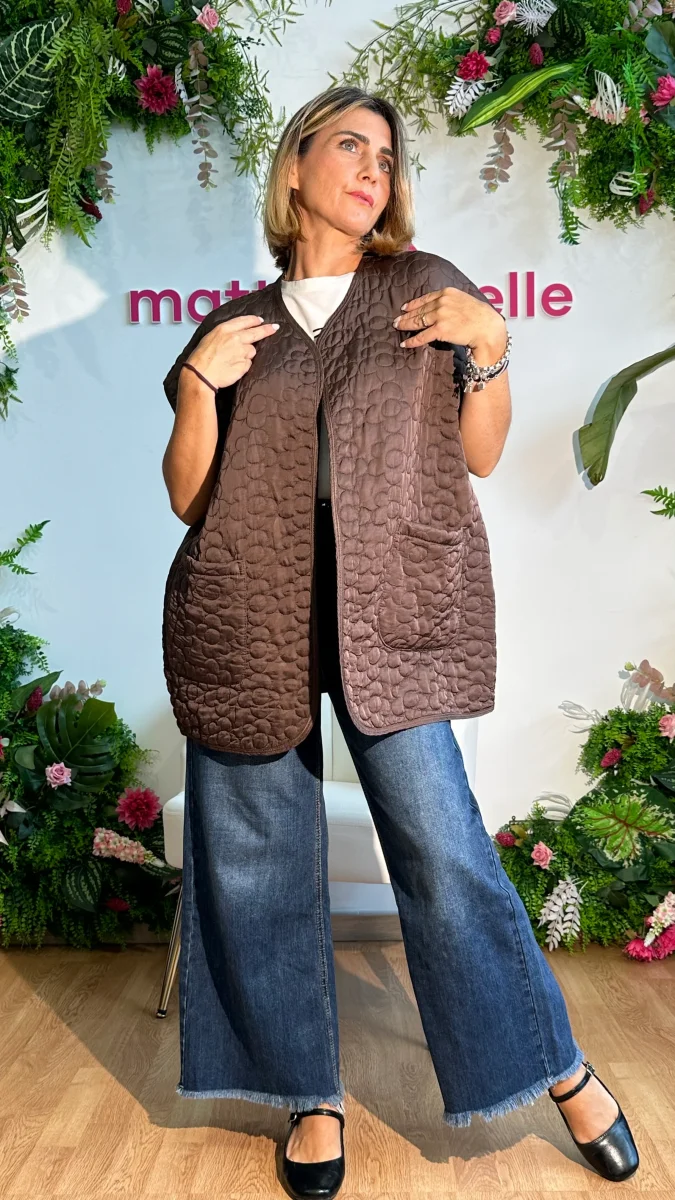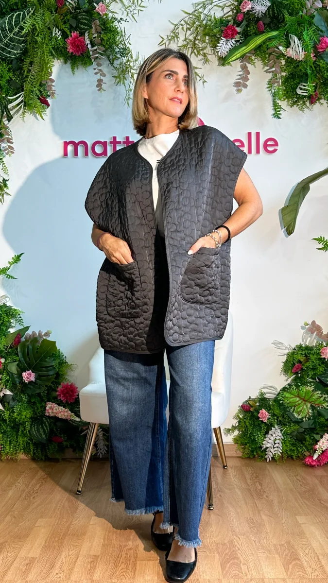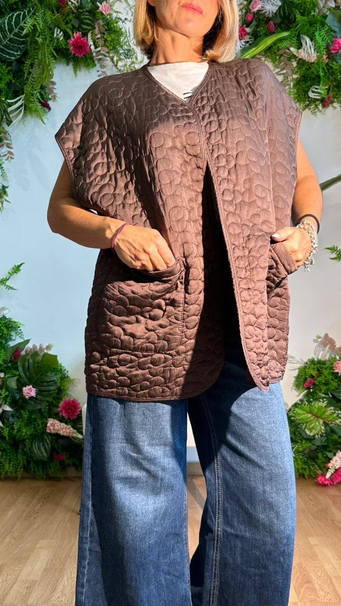 Rivela il tuo stile con lo smanicato Fiore in 100% viscosa! Il suo design trapuntato e la vestibilitร over size ti terranno caldo e alla moda. Le tasche trasversali offrono comoditร senza sacrificare lo stile. Aggiungi questo capo versatile al tuo guardaroba per un look unico e alla moda!