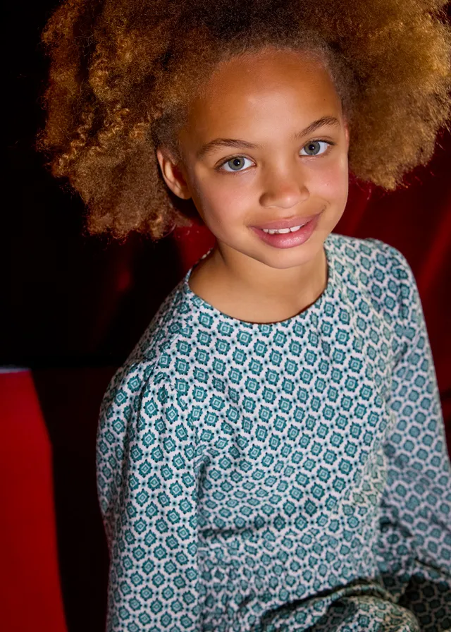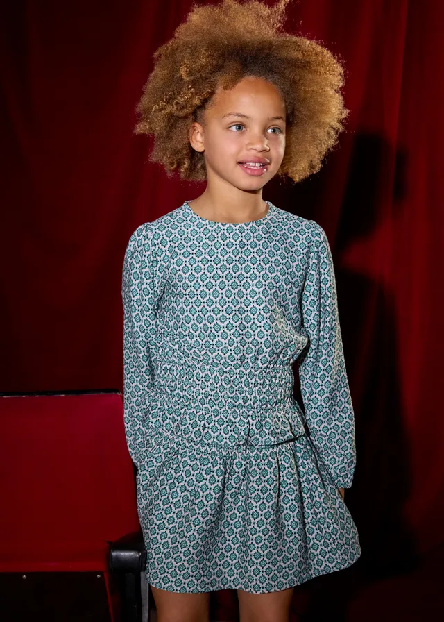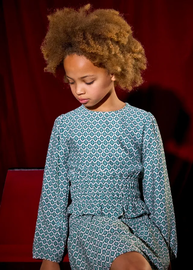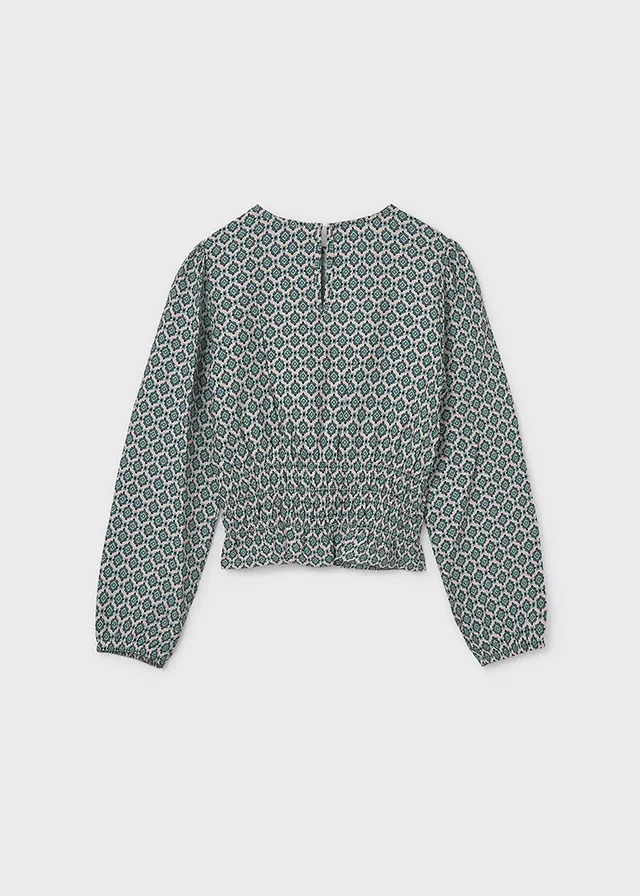 Blusa manica lunga per ragazza con polsini elasticizzati nella parte interna. Girocollo. Piccola apertura sulla schiena con chiusura con bottone per facilitare la vestibilitร del capo. Confezione in tessuto crepรจ morbido. Elementi decorativi: Dettagli arricciati punto smock (nido d’ape). Design stampato.