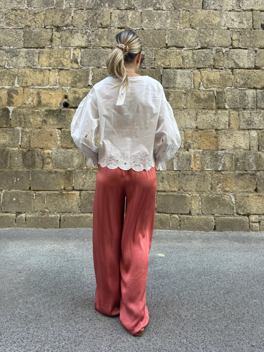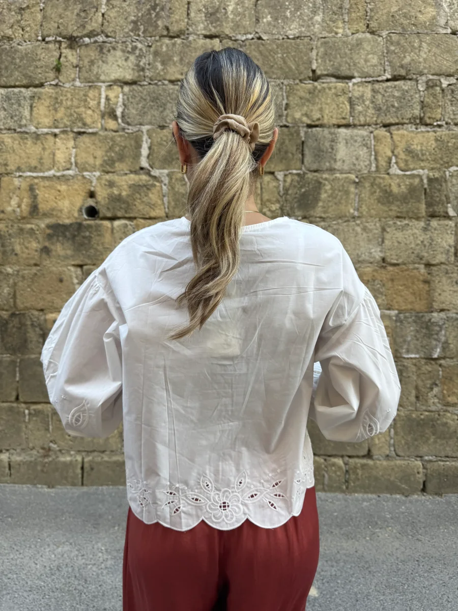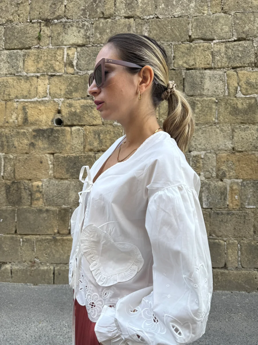 Camicia in cotone Dettaglio in pizzo San gallo Vestibilitร morbida La modella รจ alta 1.65 indossa la taglia s/m
