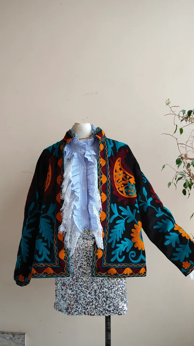 Il tessuto, confortevole e leggermente elasticizzato, accompagna i movimenti senza costringere. È un capo versatile, ideale sia per look quotidiani più ricercati che per occasioni speciali, abbinata a denim, gonne o pantaloni sartoriali.