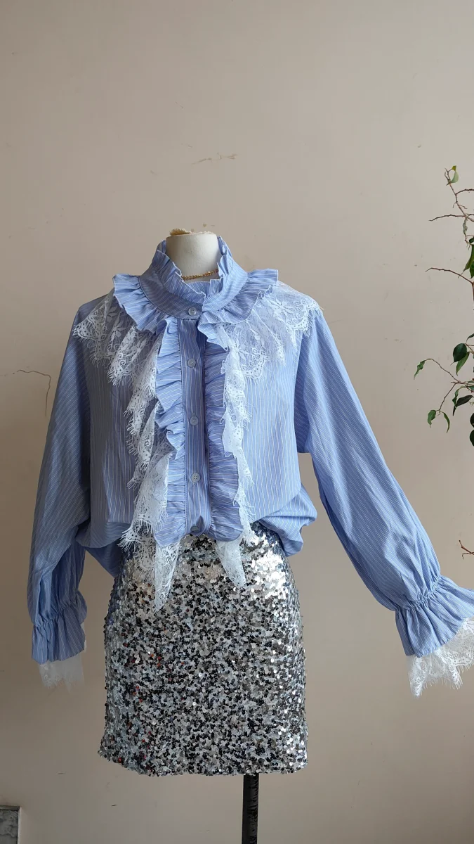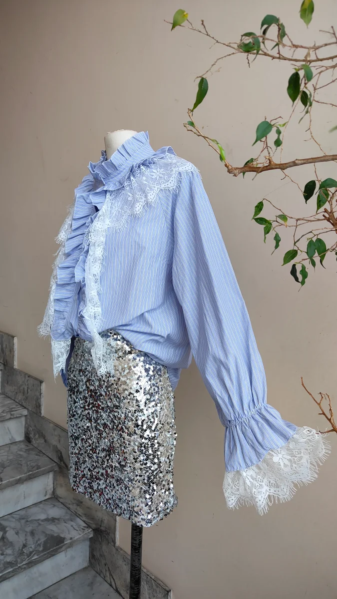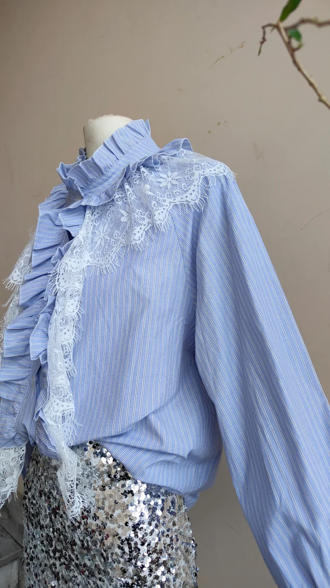 Camicia dallo stile delicato e femminile, pensata per chi ama i dettagli curati. Le balze sul davanti impreziosite dall’inserto in pizzo creano un gioco di volumi leggero e raffinato, mentre il collo arricciato e le maniche morbide donano armonia alla silhouette.