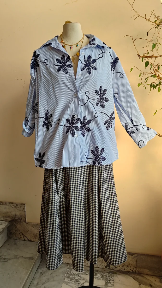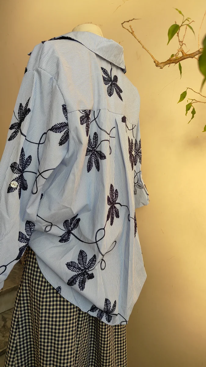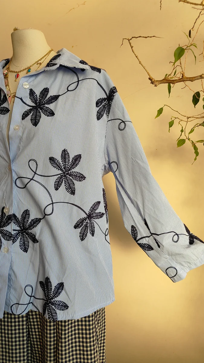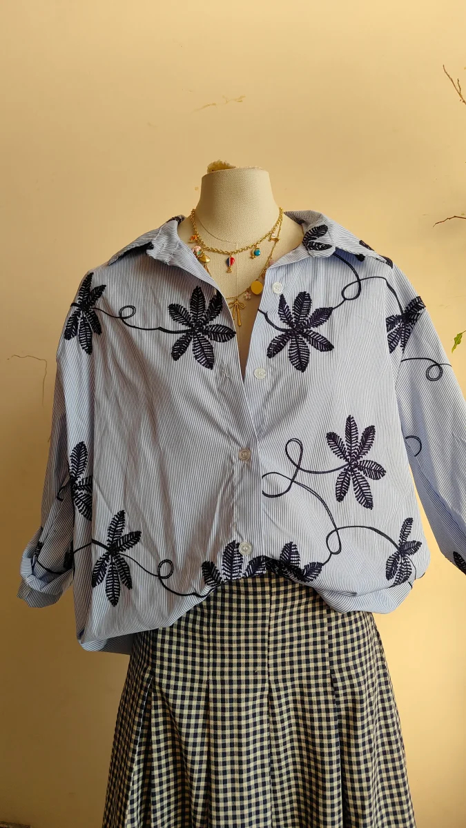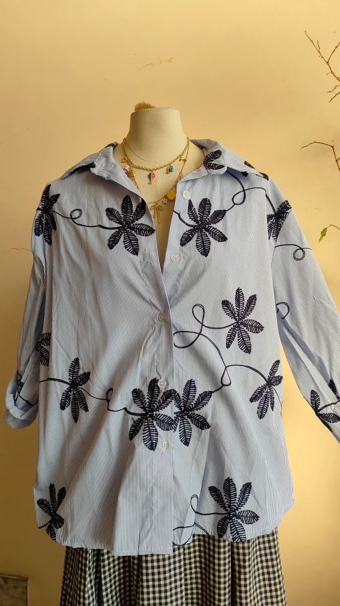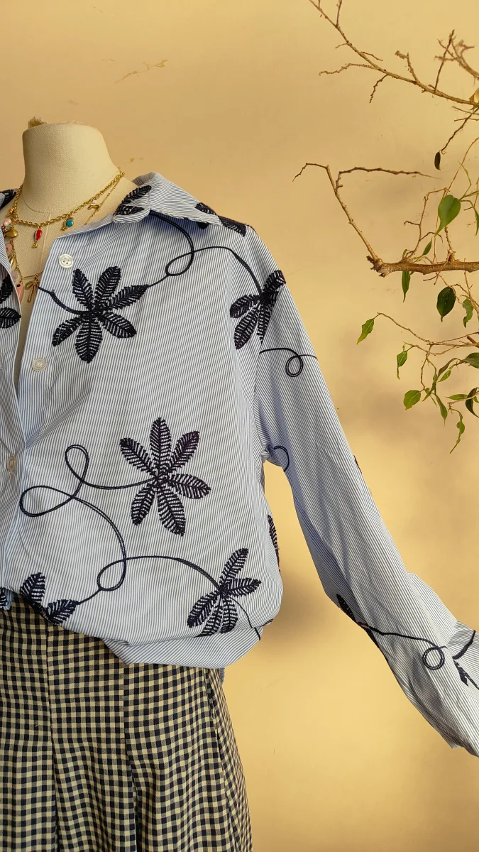 Una camicia leggera e contemporanea, caratterizzata da una base a righe sottili arricchita da ricami decorativi che creano un elegante motivo botanico. Il contrasto tra la struttura della camicia e i ricami dona al capo personalità e movimento, rendendolo raffinato ma facile da indossare.