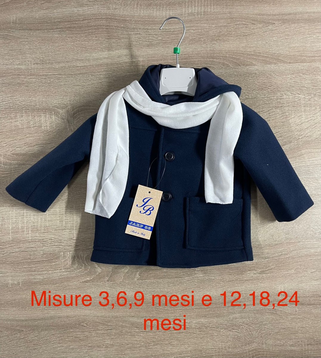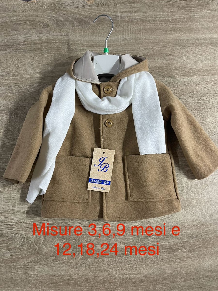 Cappottino bimbo con cappuccio e sciarpa in coordinato. Chusura con bottoni e due comode tasche laterali.