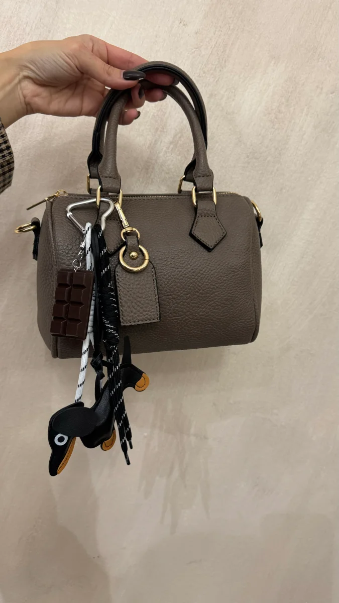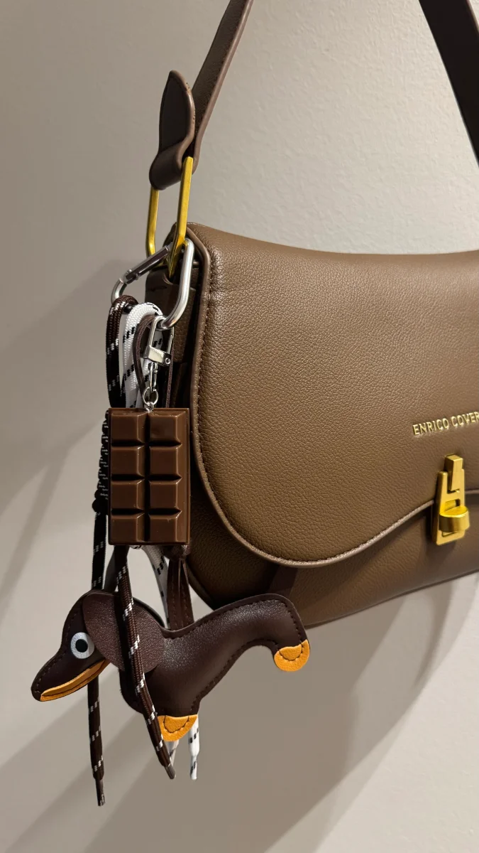 Portachiavi con bassotto e tavoletta di cioccolato, ideale per borse e portachiavi.