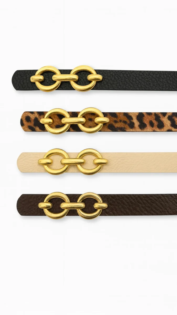Contura caratterizzata da una chiusura a catena con due anelli ovali di colore dorato, collegati da un terzo anello centrale. Il cinturino รจ stretto e sottile, disponibile in quattro varianti di colore/fantasia: nero, leopardato, beige chiaro e marrone scuro. materiale: Pelle