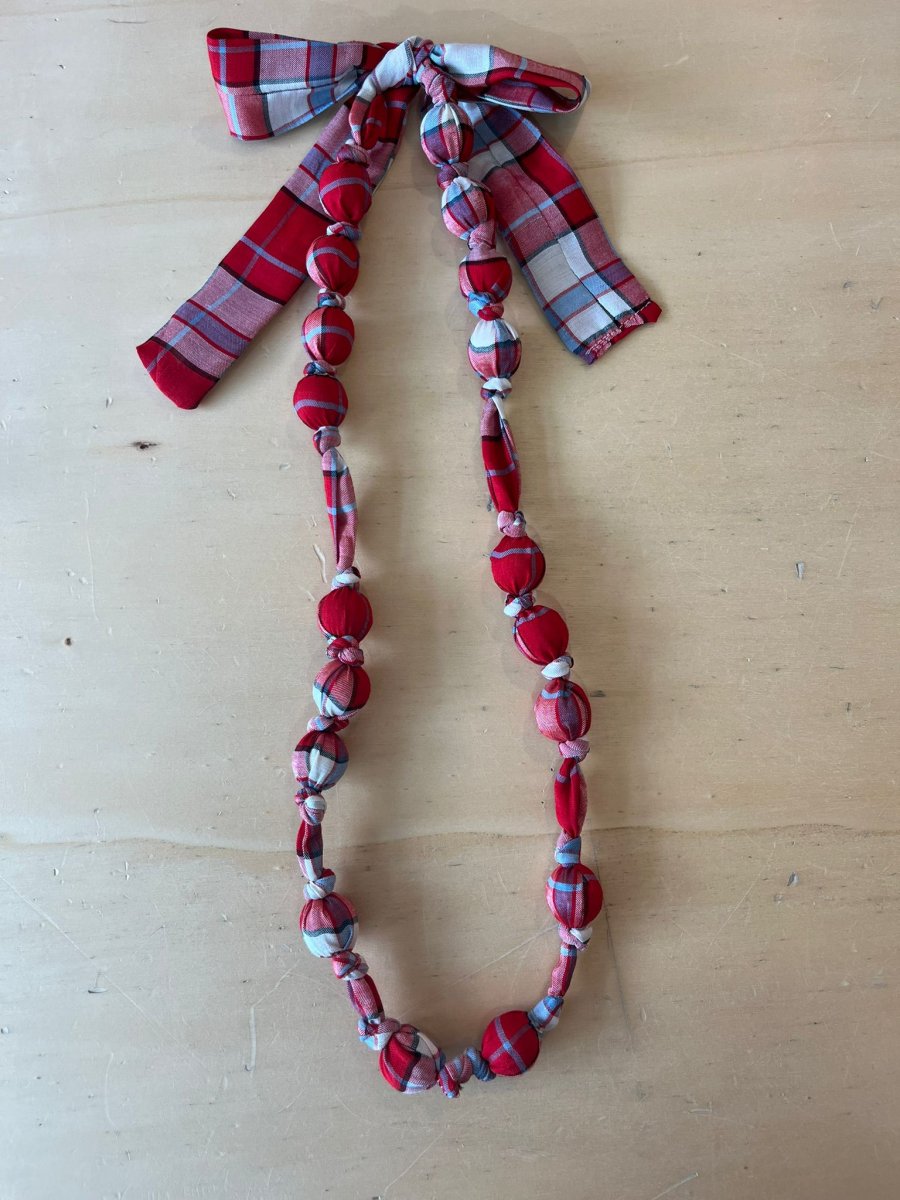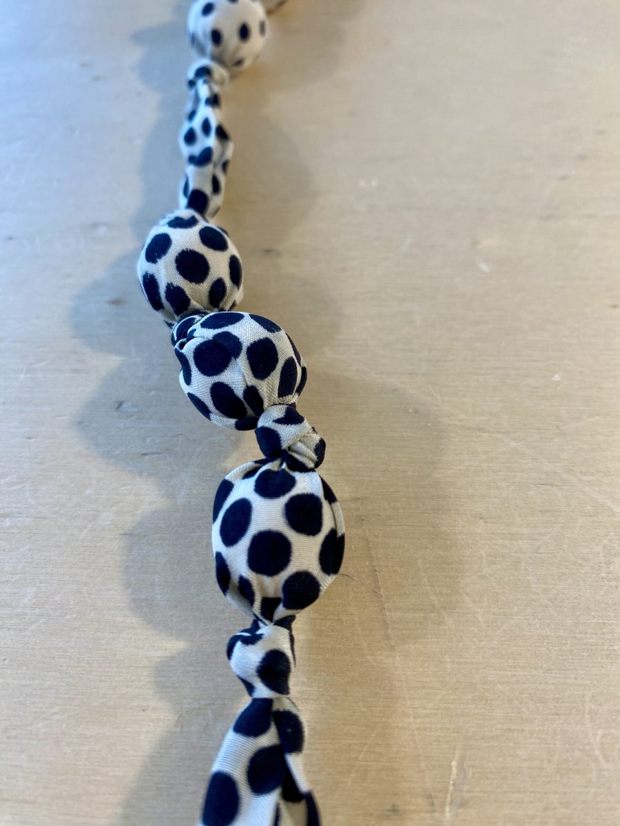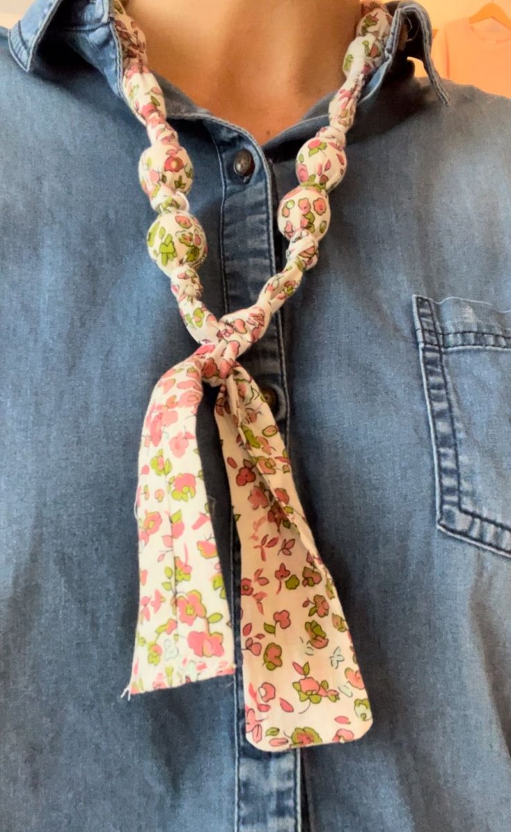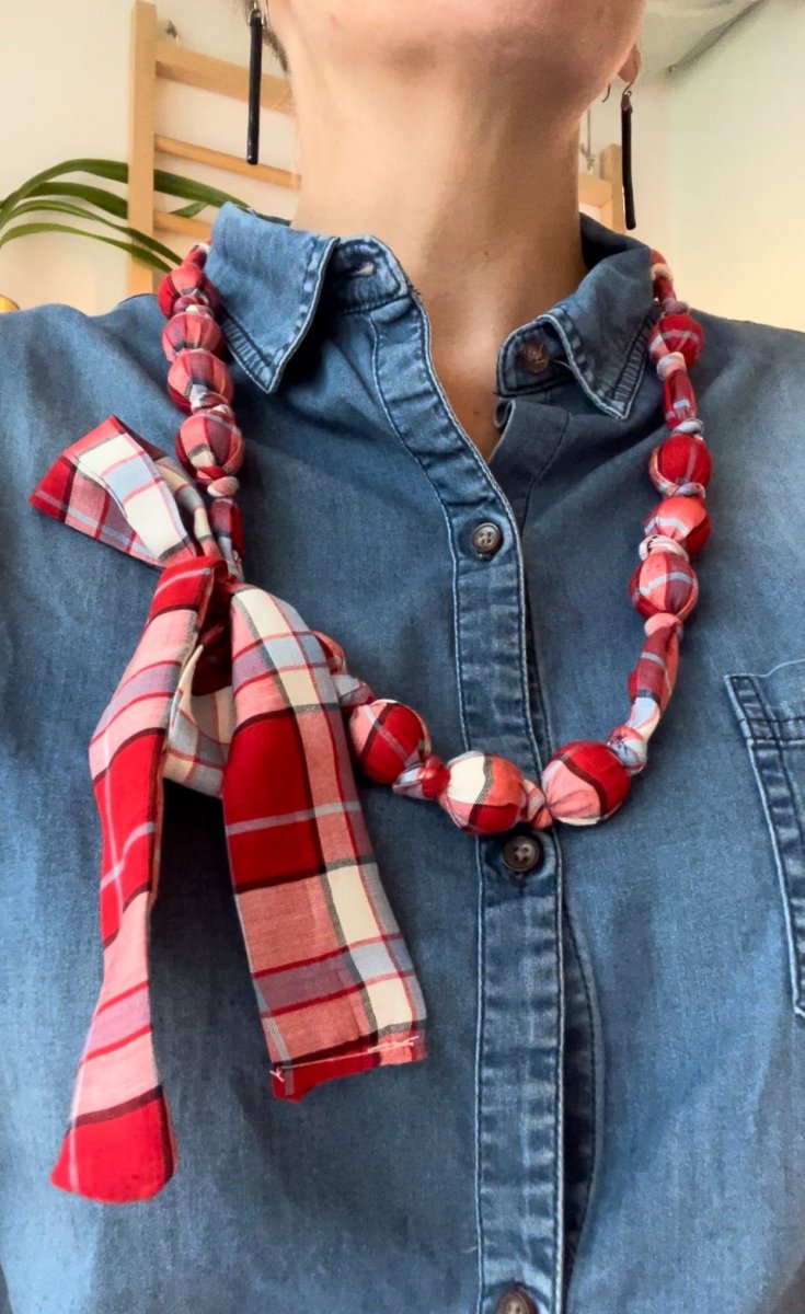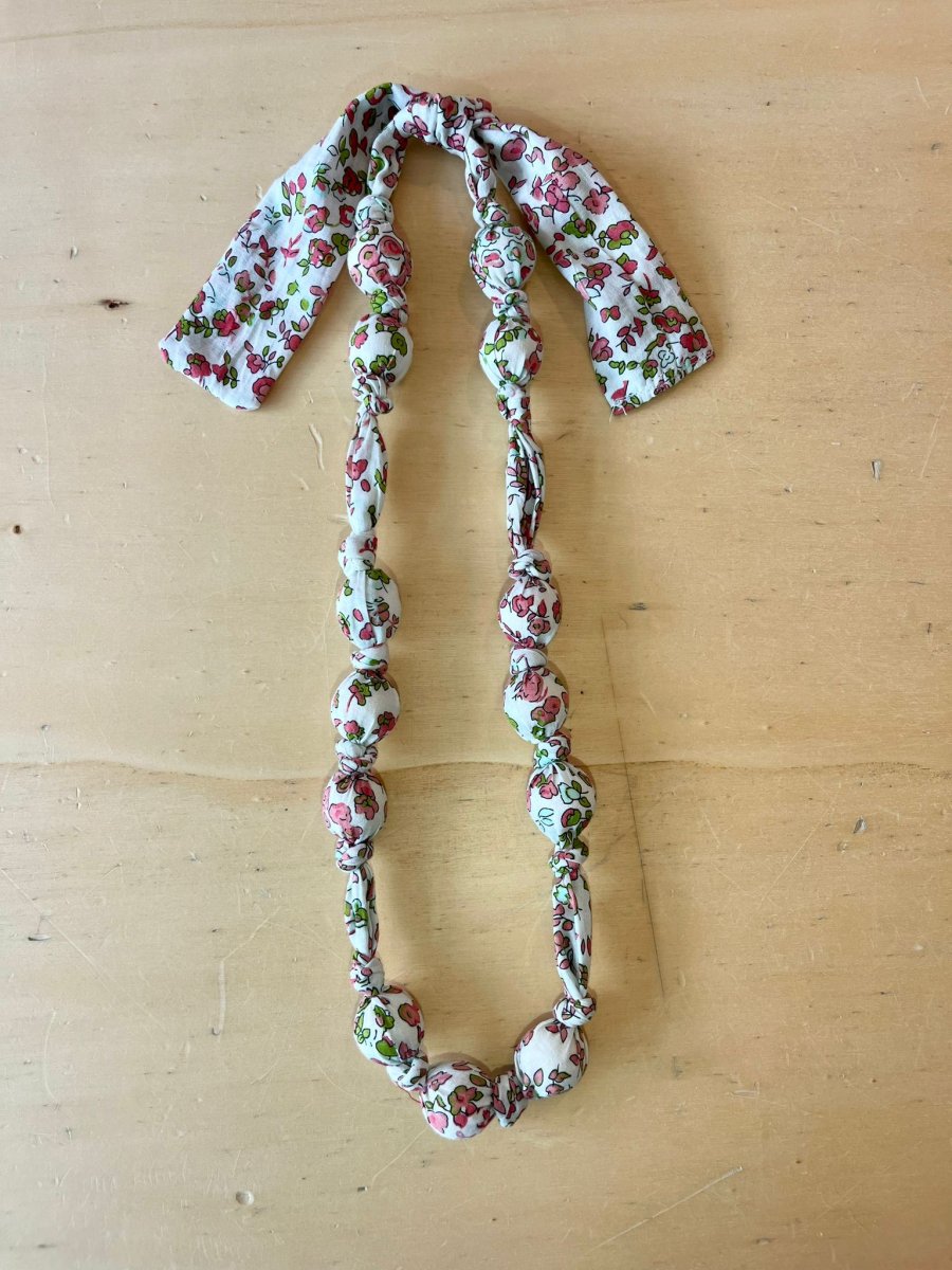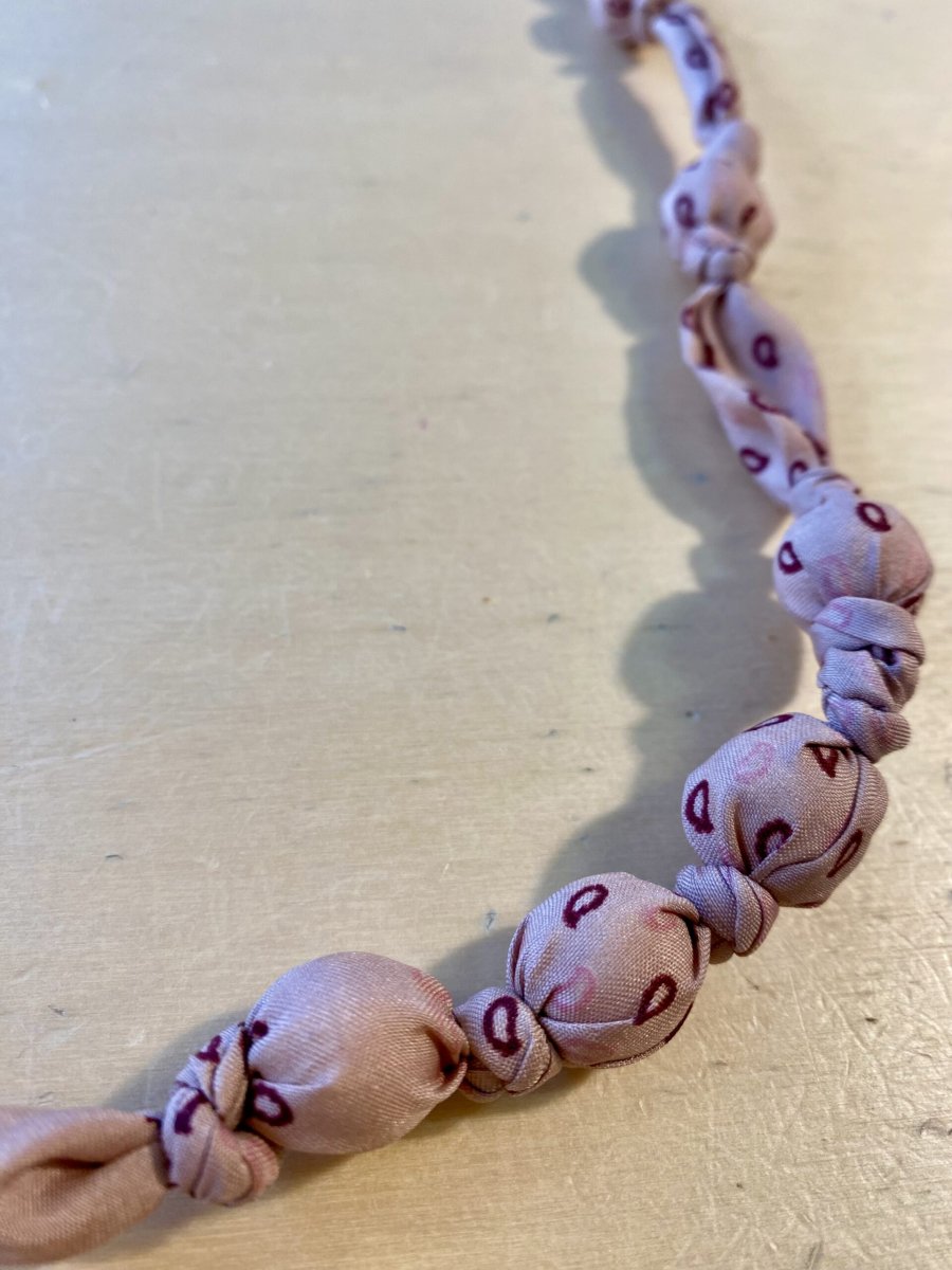 La collana รจ realizzata in seta 100%, proveniente da pregiati foulard di seta (materiale ultra resistente). Questo le rende dei pezzi unici irripetibili.
