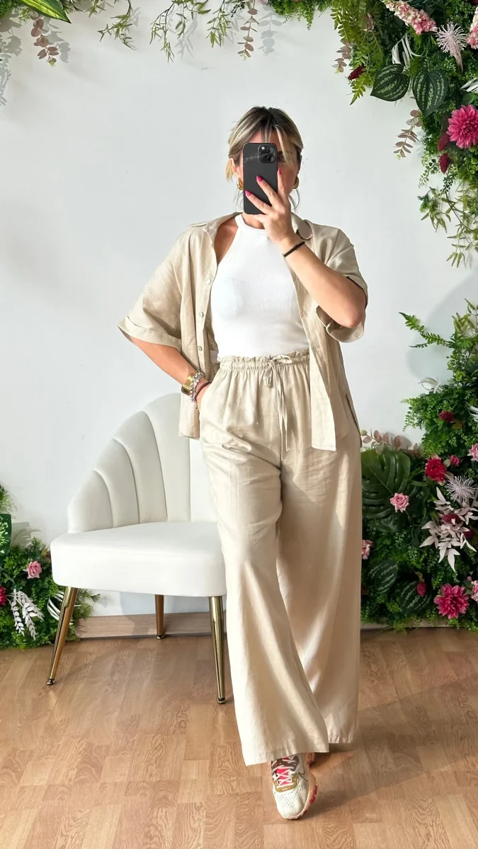 Esclusiva ed elegante, il coordinato set Victoria ti farร sentire come una vera regina. Realizzati in pregiata miscela di viscosa e lino, i pantaloni palazzo presentano una comoda banda elastica in vita e pratiche tasche laterali. La blusa over รจ caratterizzata da un’elegante chiusura con bottoni e mezza manica, regalandoti un look casual e di classe.