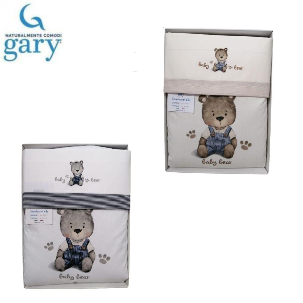 GARY, coordinato neonato per carrozzina/cullina ospedale. Set composto da: lenzuolo sopra, lenzuolo sotto con angolo, federa e piumino sfoderabile. Coordinato con piumino sfoderabile. Lenzuolo: 90ร120 cm. Piumino: 70ร85 cm. STAGIONE DEL PRODOTTO: AUTUNNO / INVERNO