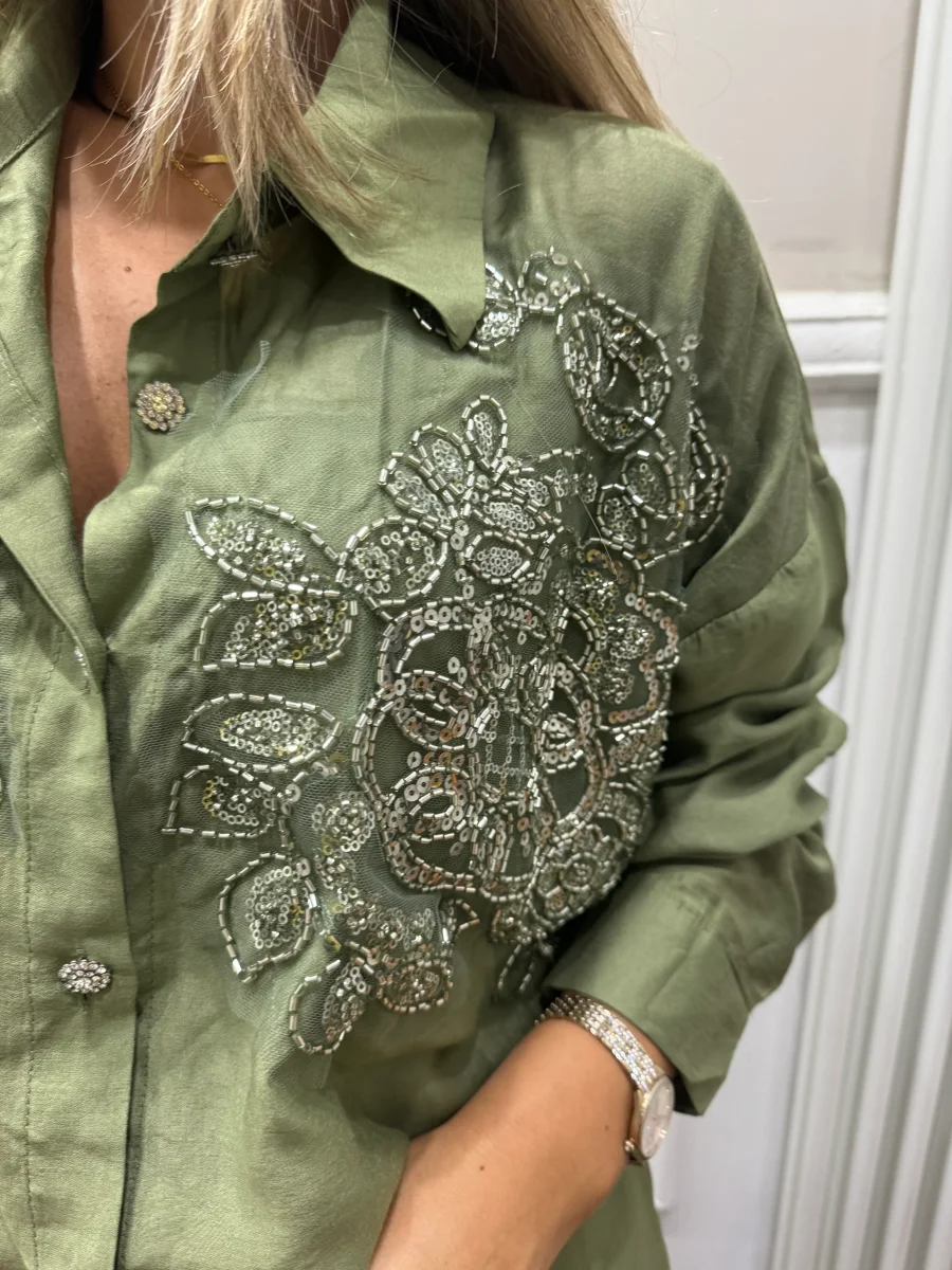 camicia con bottoni gioiello e applicazione di perline e paillettes silver