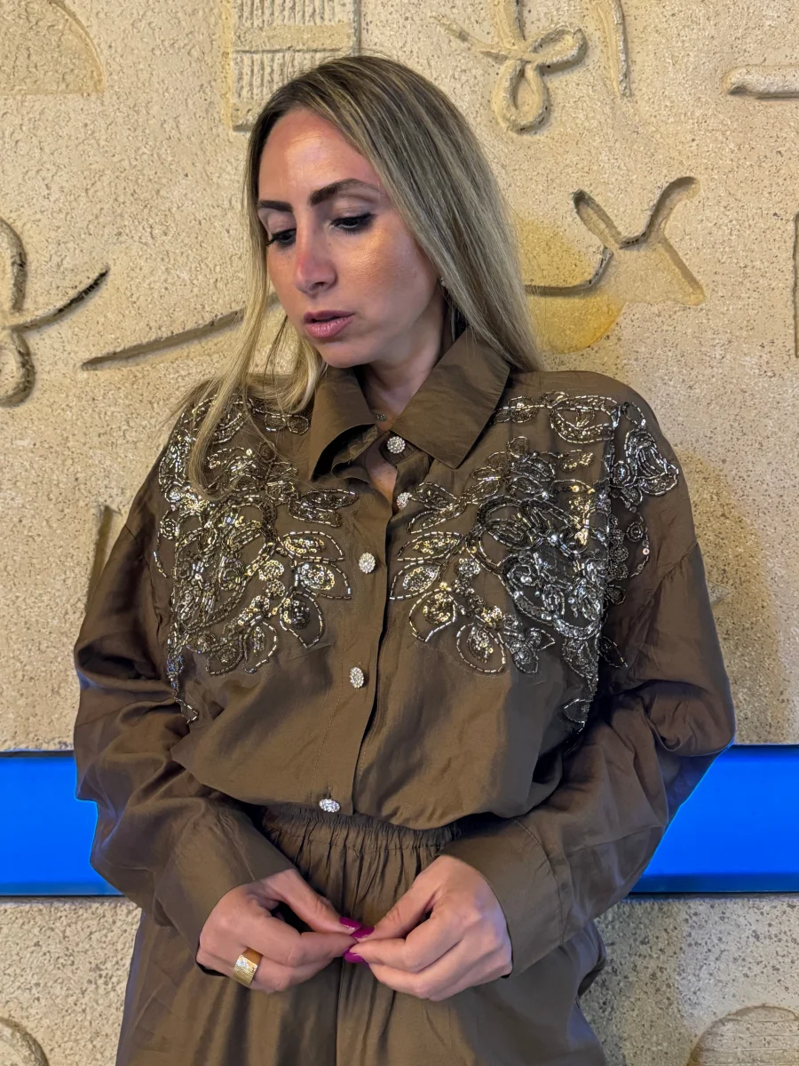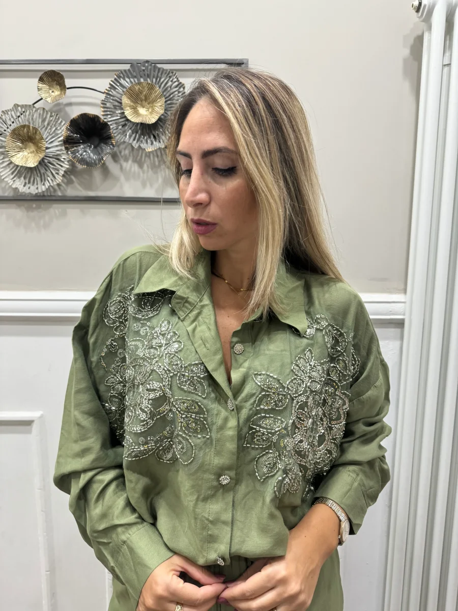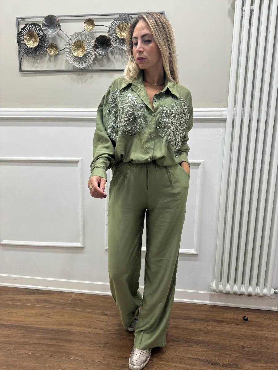 coordinato composto da camicia con bottoni gioiello e applicazione di perline e paillettes silver pantapalazzo vita alta con tasche ,elastico nel girovita TOP QUALITY vestibilitร regolare , la modella indossa tg S/M