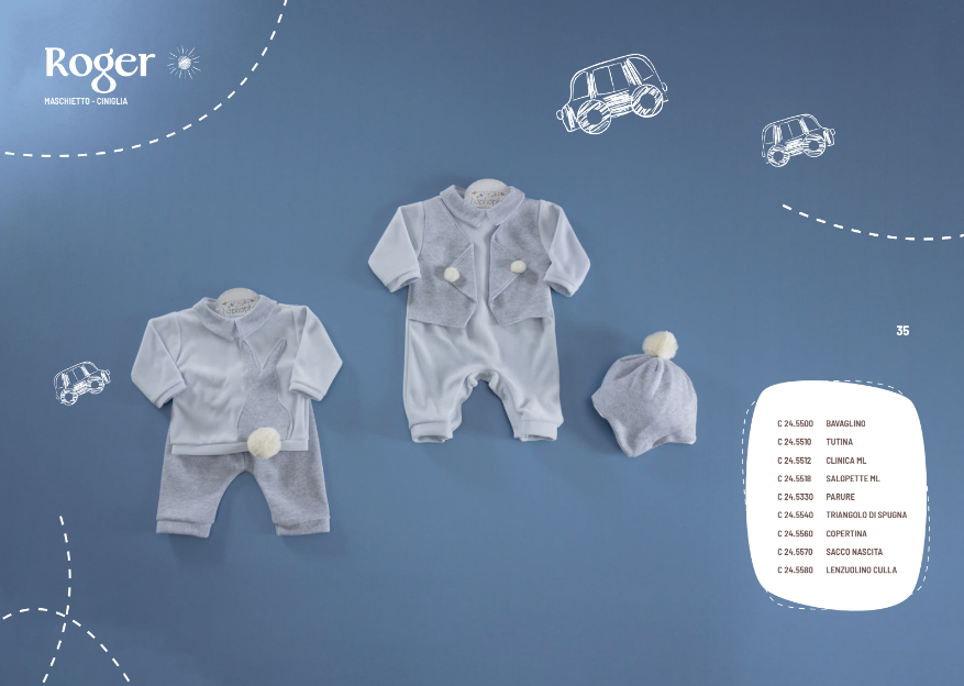 | VARIANTE | Bavetta, Cappellino+Scarpette, Copertina, Lenzuolino, Salopette, Tutina, Tutina due pezzi |