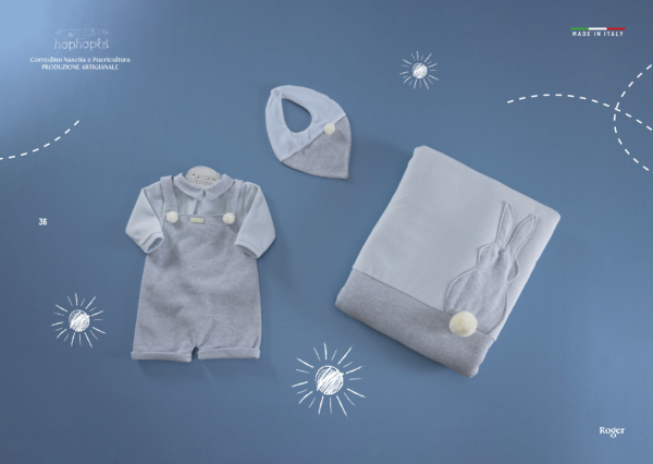 Set nascita in ciniglia, linea Hophoplร , tema Roger Questi capi sono produzioni artigianali, lavorati con manifattura 100% ITALIANA, con materiali selezionati di altissima qualitร Taglia Unica 1-3 mesi.