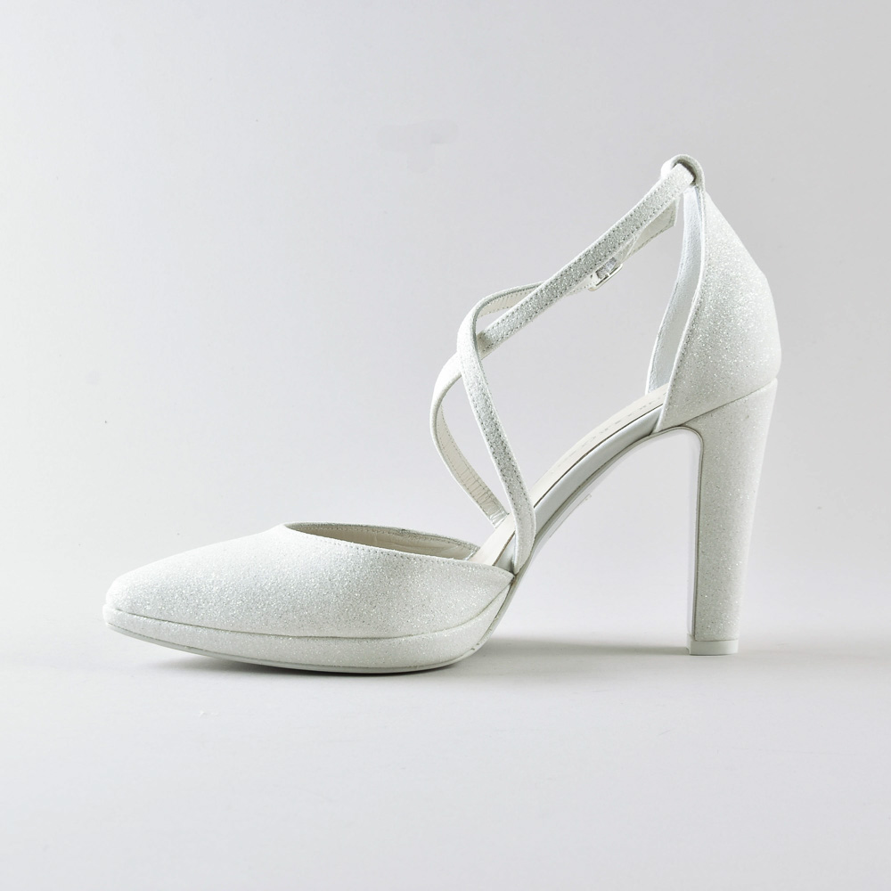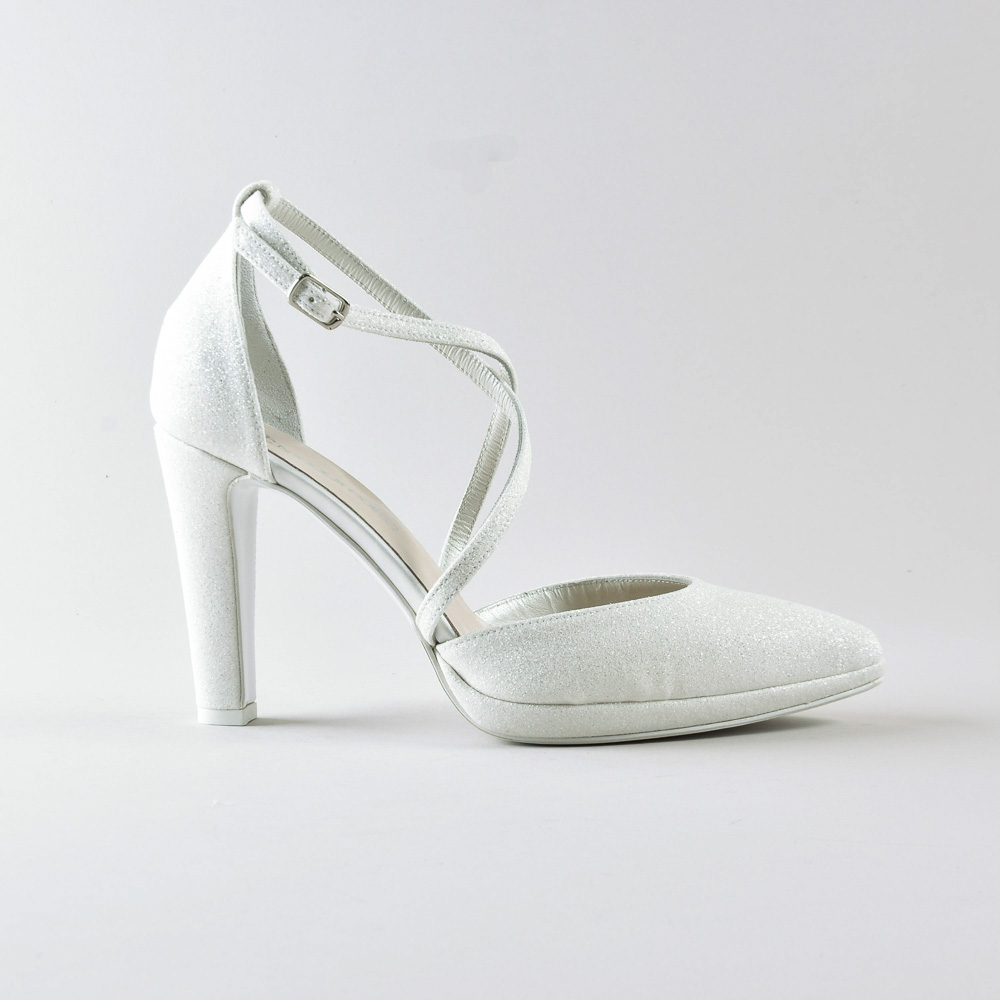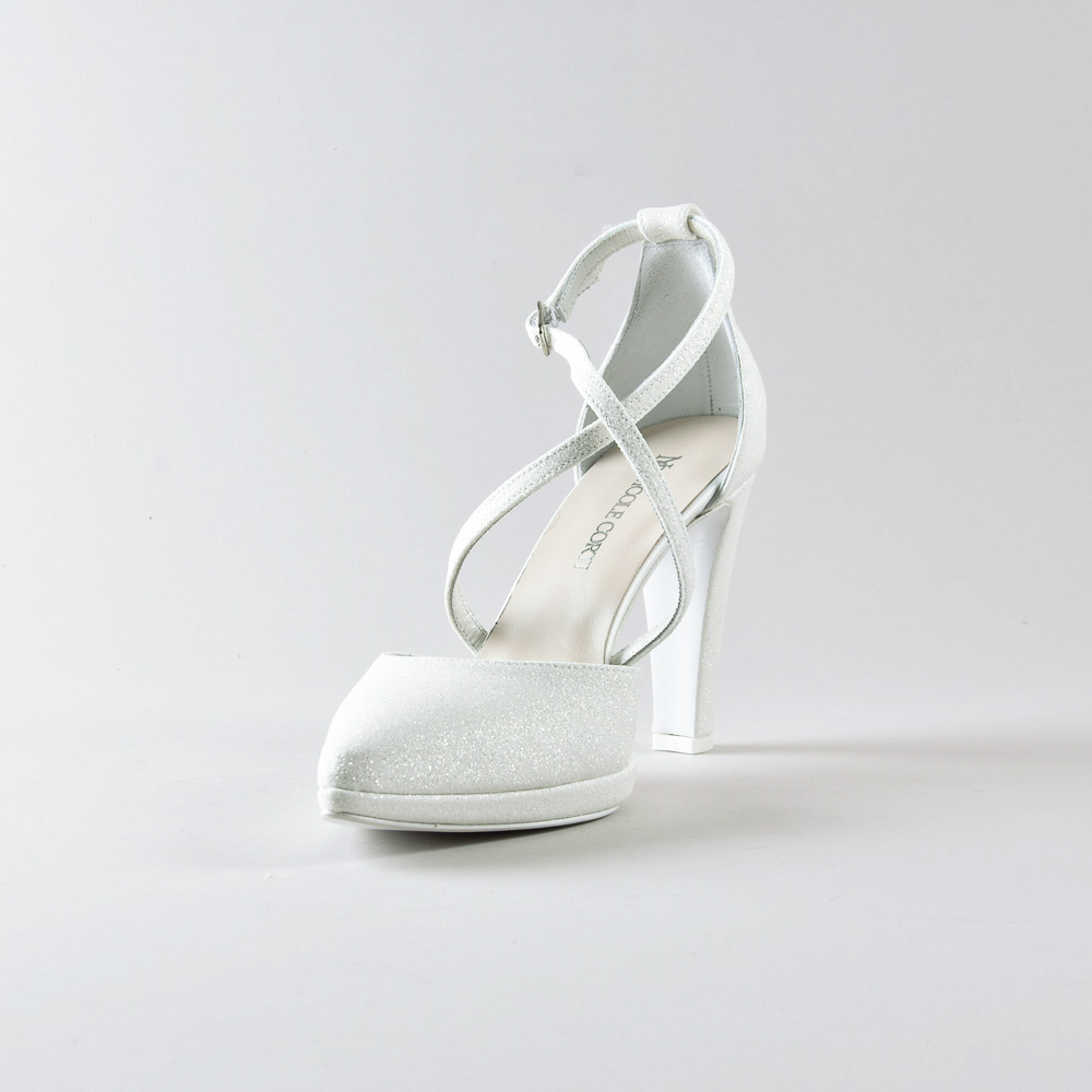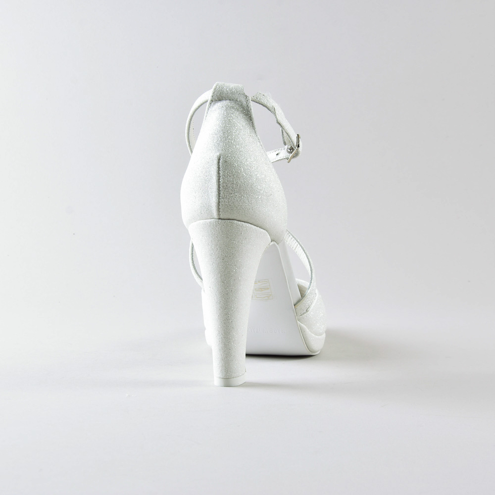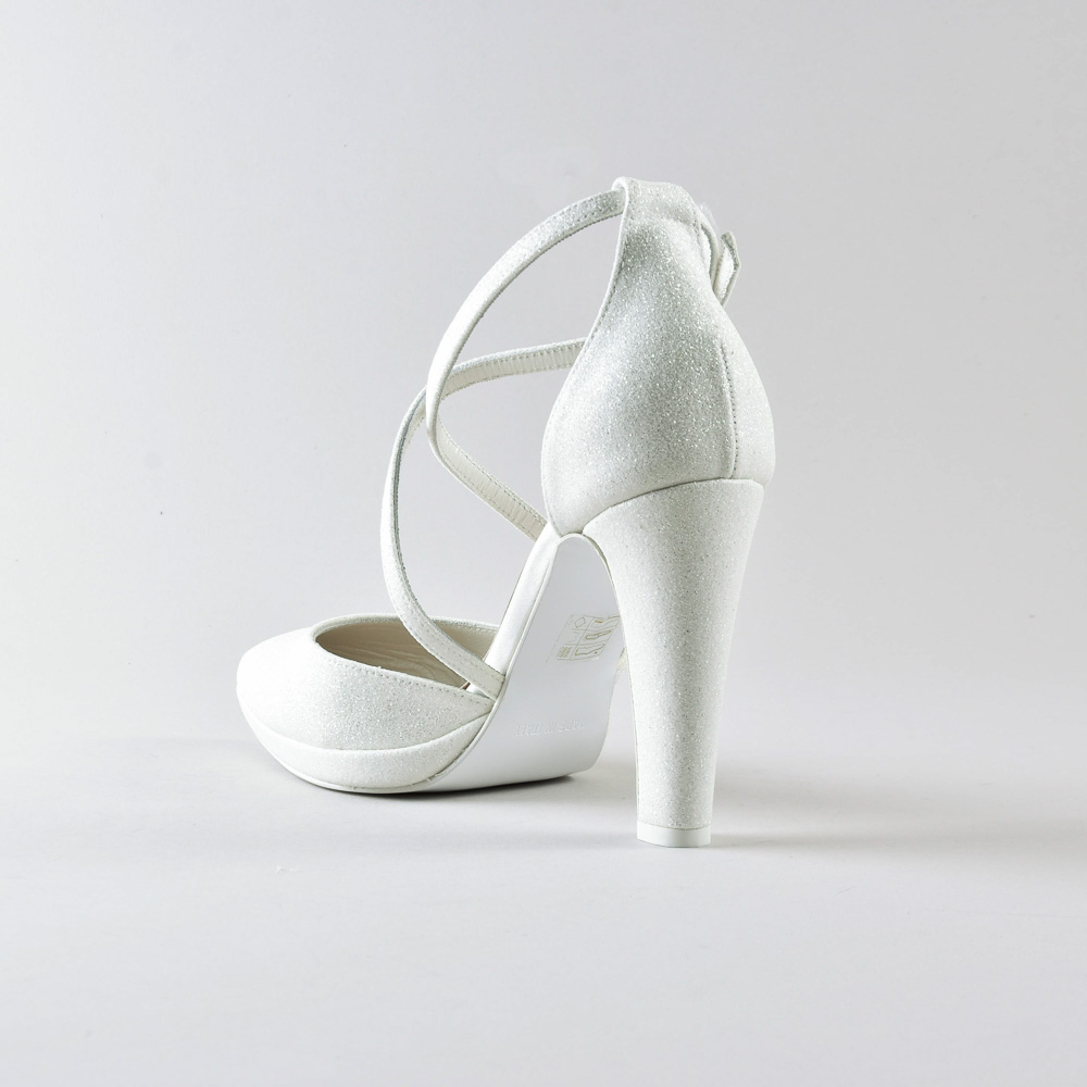 Le Cross Strap Penny di NIKI CORTI, con un tacco di 100mm e plateau, sono l’opzione ideale per la sposa che cerca comfort senza rinunciare a uno stile scintillante. Realizzate in glitter avorio, queste scarpe offrono un tocco glamour perfetto per il giorno del matrimonio. Il plateau integrato permette di bilanciare l’altezza del tacco, garantendo una camminata stabile e confortevole.