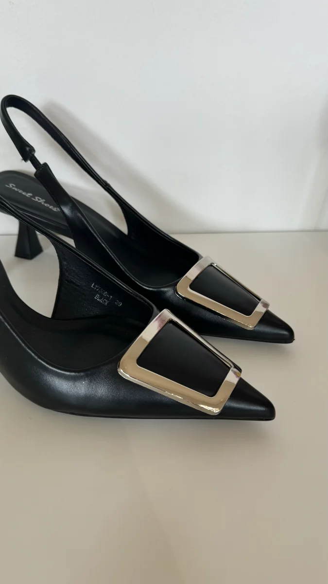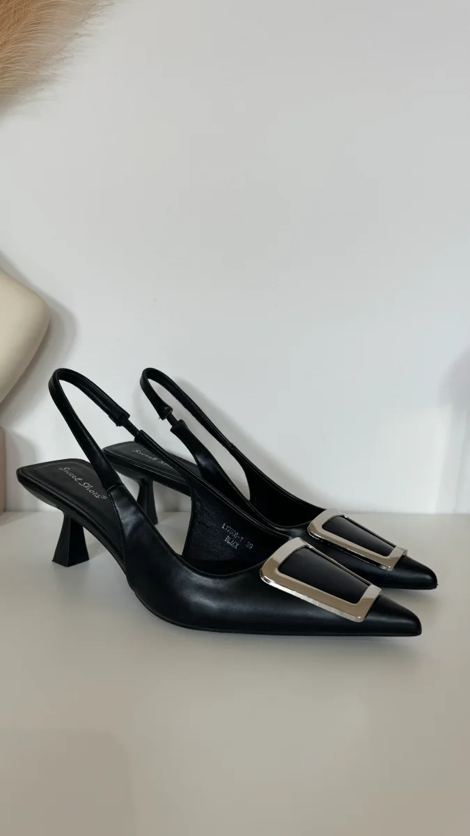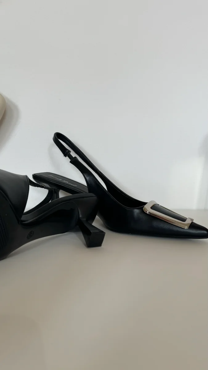 Bellissima décolleté con cinturino elasticizzato, dettaglio ottone sulla punta. Modello aperto sul retro, tacco moderno con fondo quadrato alto 4 cm, stabilitá e comfort nella calzata.