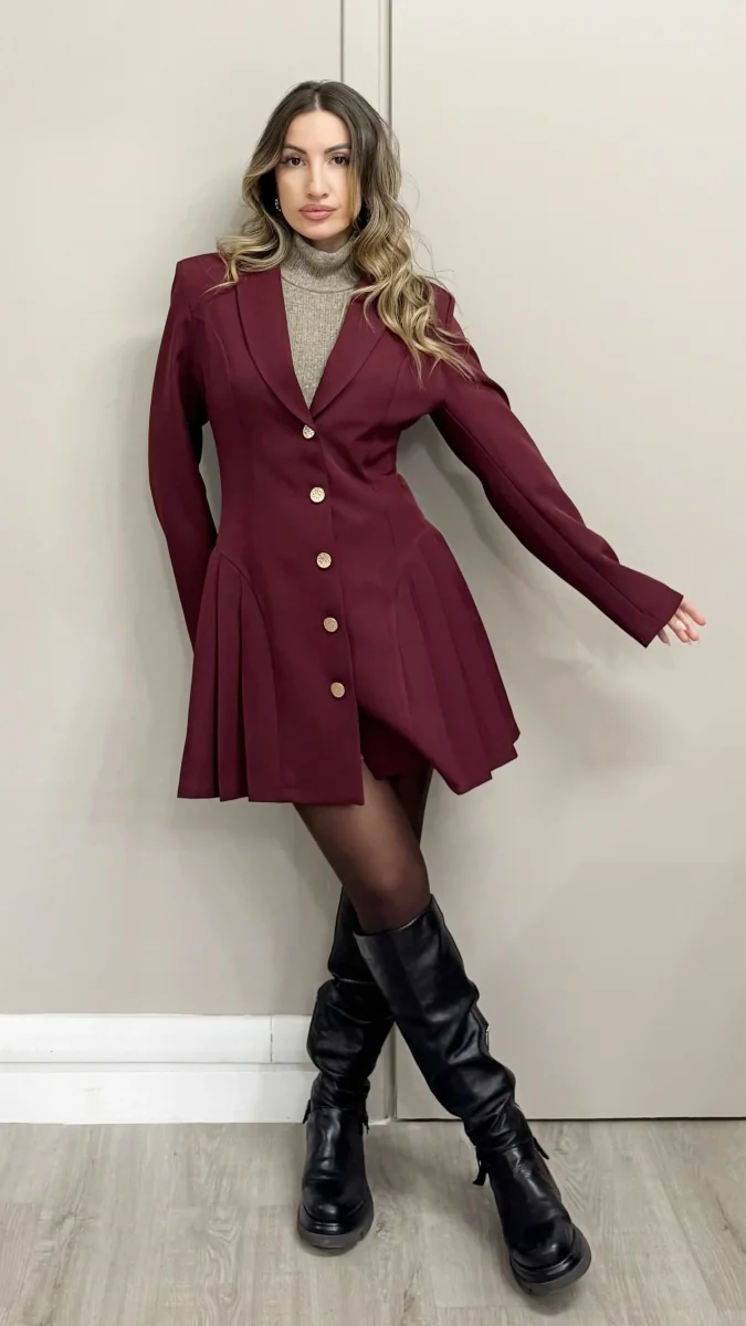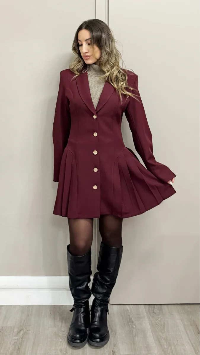 Dress con spalline imbottite e bottoni gold lavorati. Modello impunture bustier con gonna plissรจ. Lunghezza midi short.
