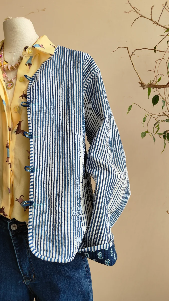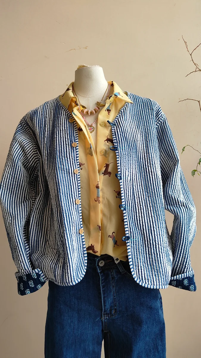 Una giacca che non passa inosservata, leggera, divertente e completamente reversibile. Funfair è il capo perfetto per chi ama cambiare stile con un gesto: da un lato una fantasia originale e giocosa con stampa effetto patch, dall’altro una base a righe più delicata e fresca.