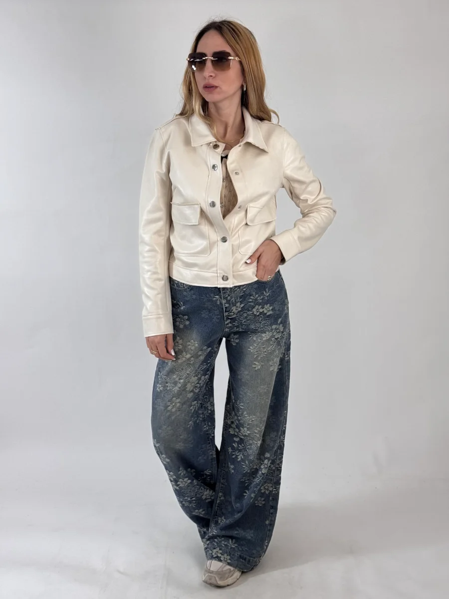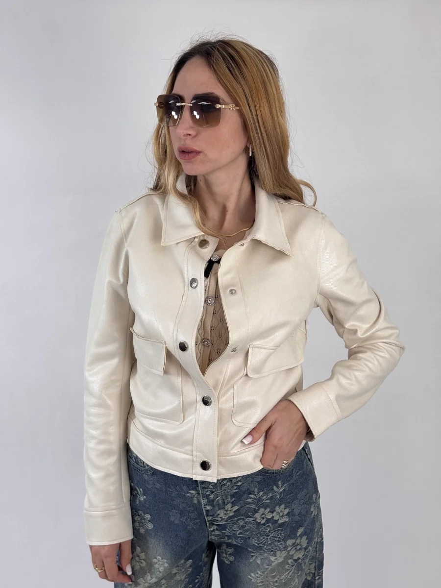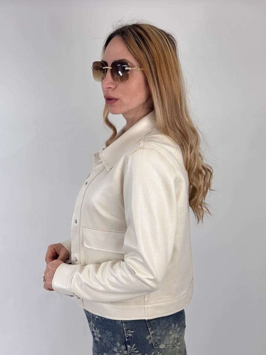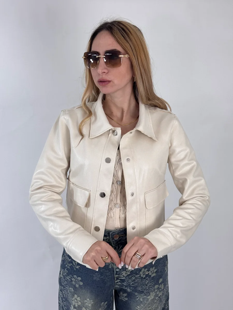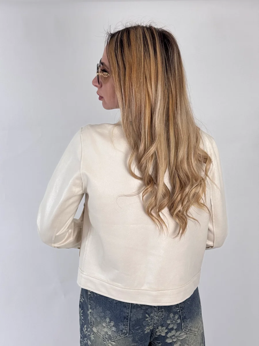 Giubbino foderato internamente, chiusura con bottoncini a pressione, vestibilitร regolare, la modella รจ alta 1.65cm e indossa tg.S/M 90% poliestere 10% elastene