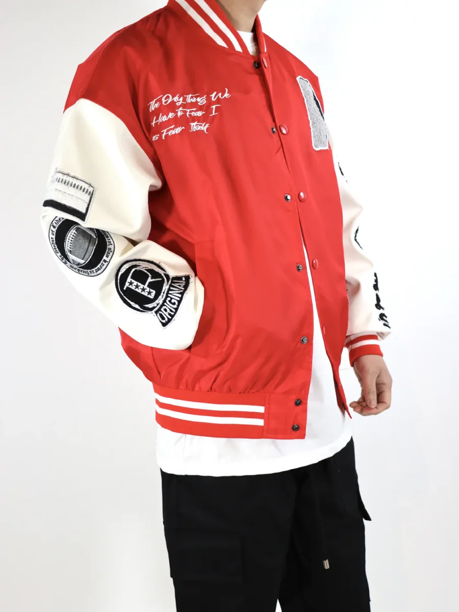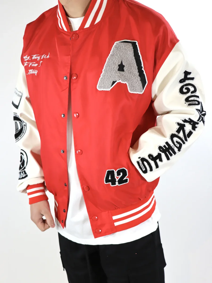 - Giubbotto modello college con maniche bianche, scritte e patch ricamate.