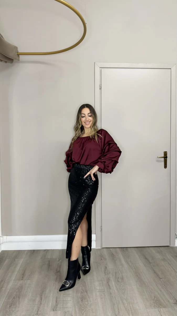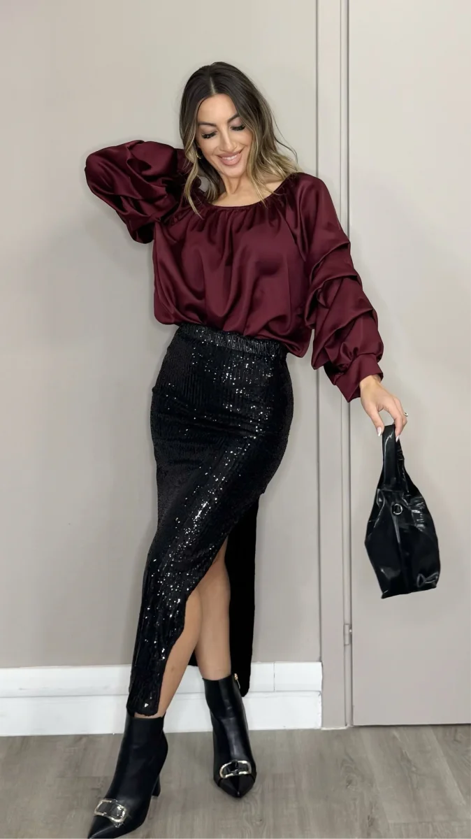 Gonna con elastico in vita e spacco laterale interamente impreziosita da paillettes.