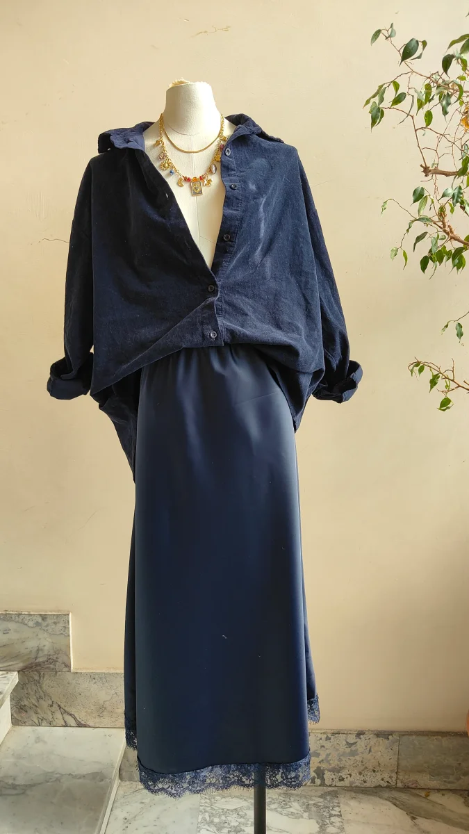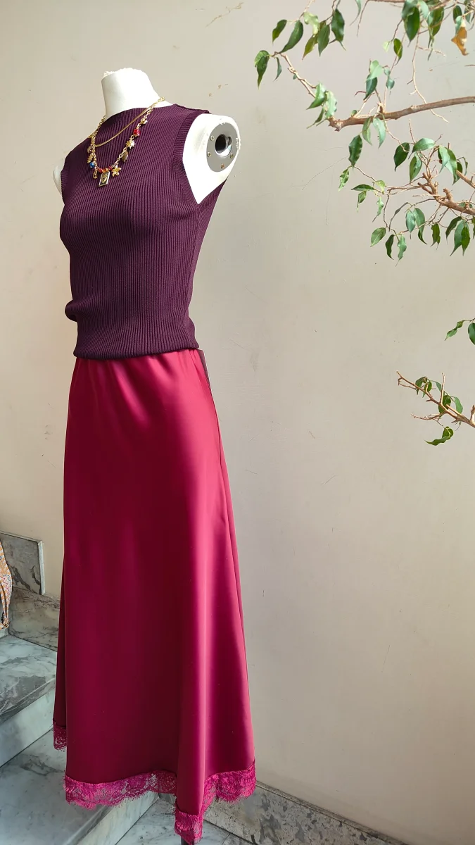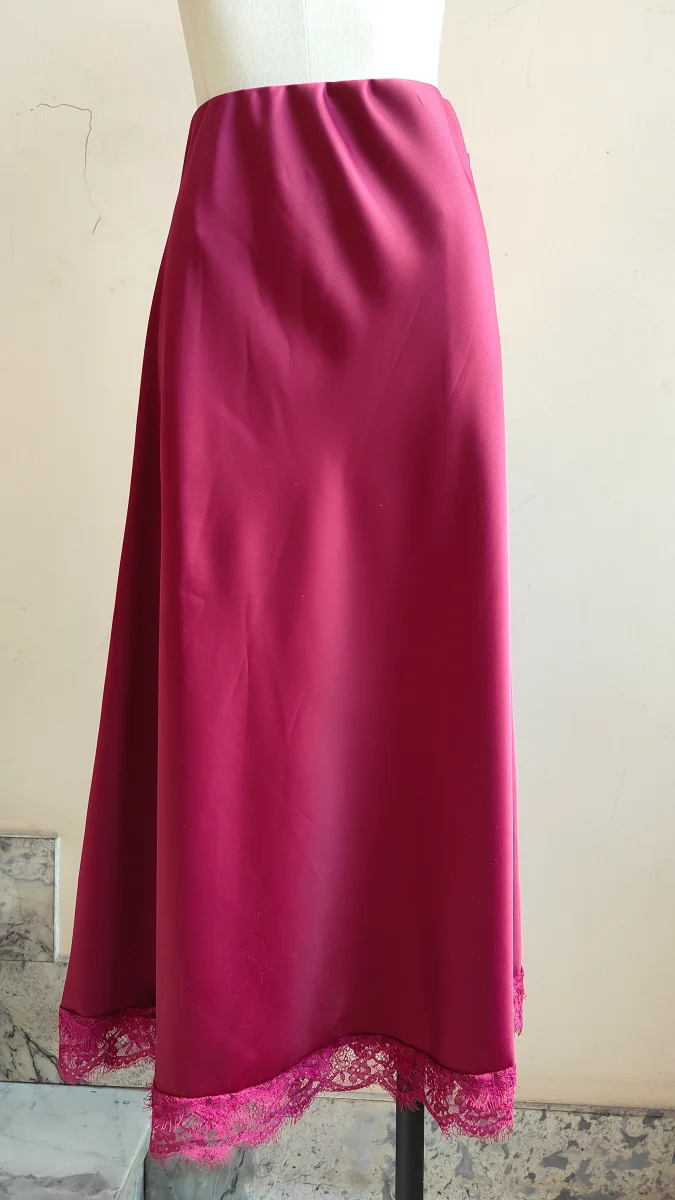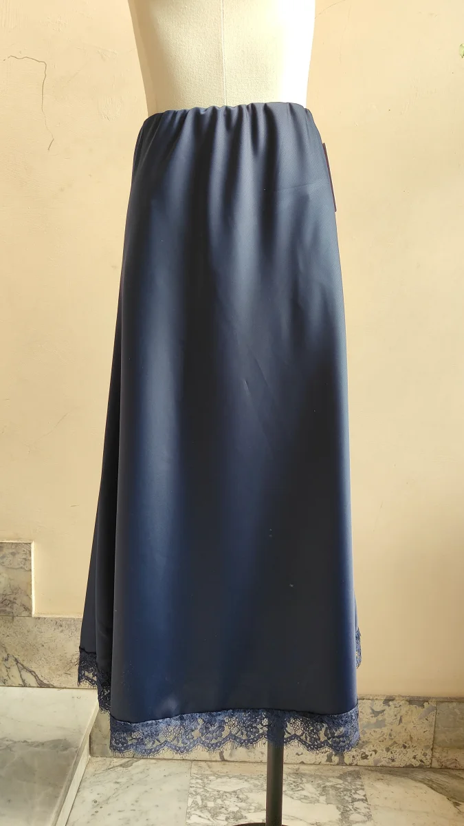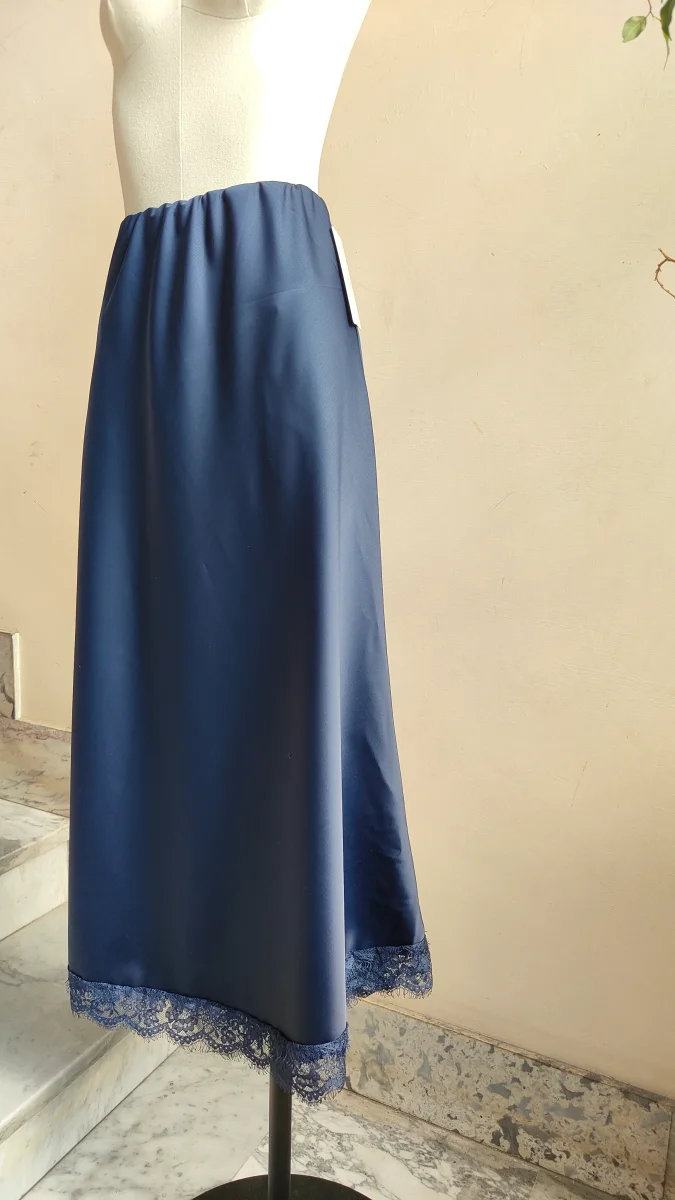 Eleganza essenziale in una gonna fluida dalla linea morbida, rifinita con delicato bordo in pizzo che aggiunge un tocco raffinato e femminile. Un capo versatile che si adatta sia a look da giorno con una camicia leggera, sia a mise serali abbinato a un top piรน ricercato.