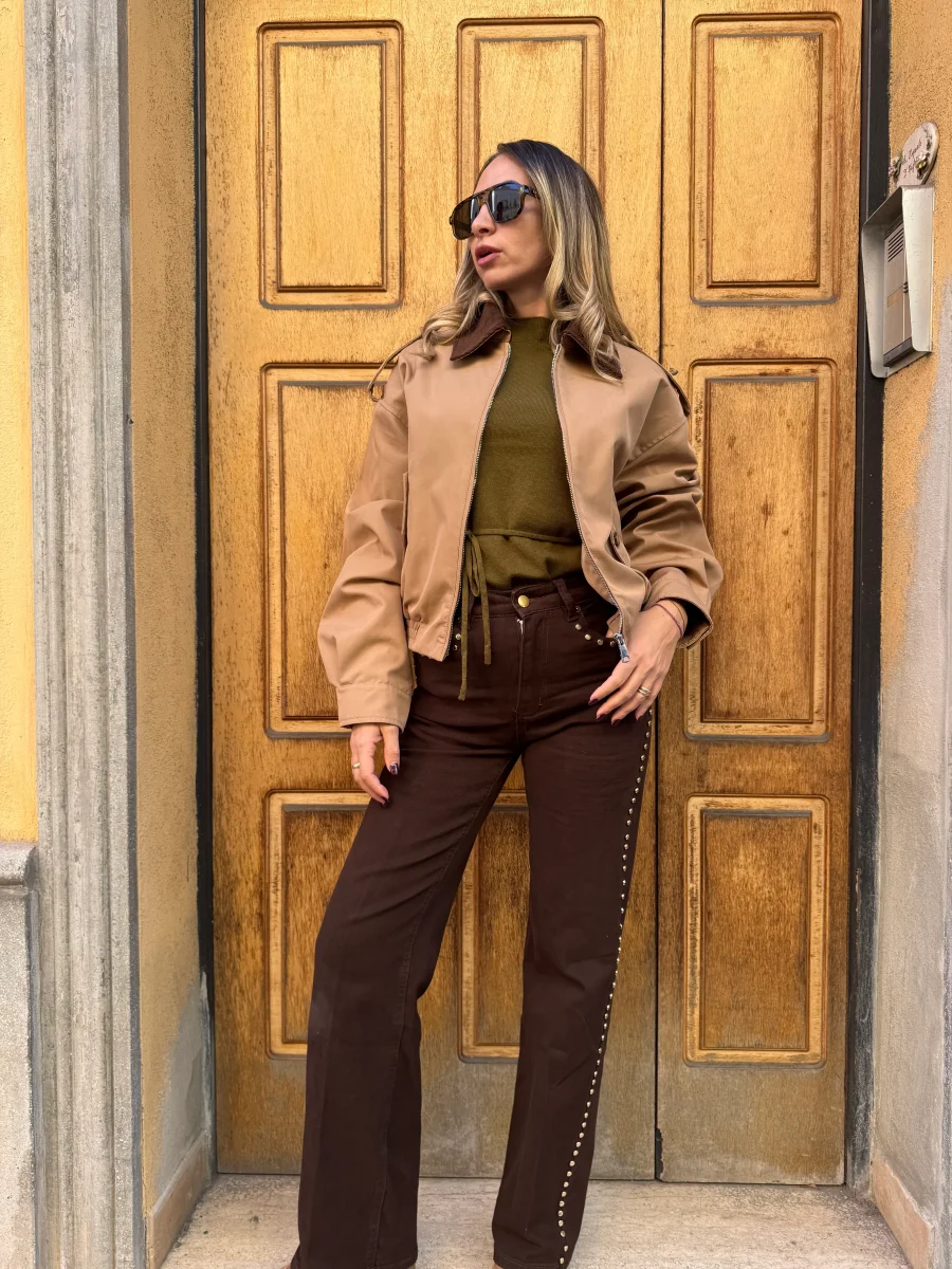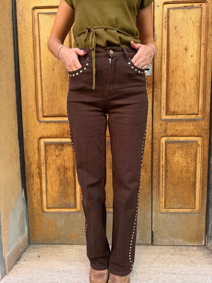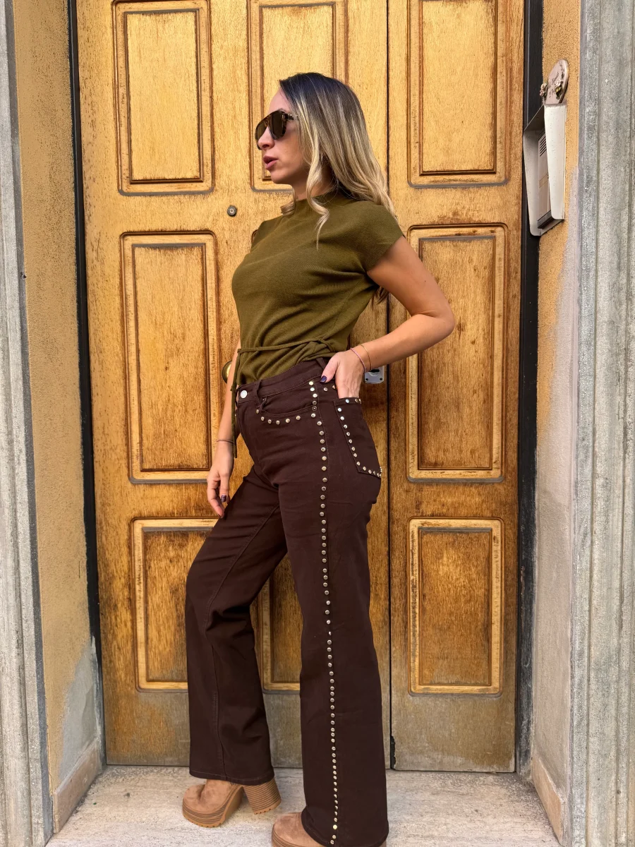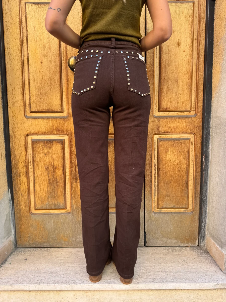 Jeans in tessuto elasticizzato con applicazione di borchie piatte lucide Vestibilitร  regolare, la modella รจ alta 1.65cm e indossa Tg.S