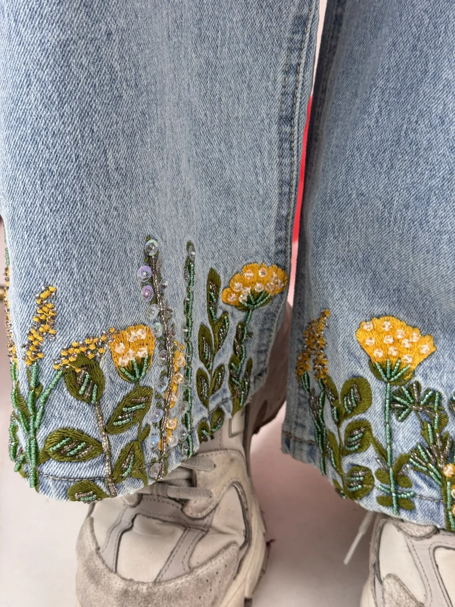 Jeans elasticizzato, con applicazzione di paillettes vestibilitร regolare, la modella รจ alta 1.65cm e indossa tg.S