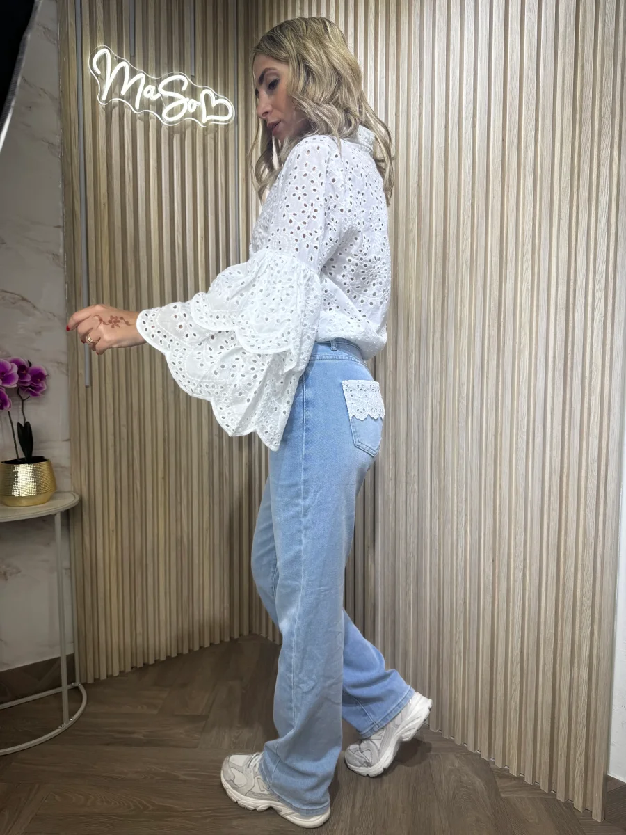Jeans in tessuto elasticizzato, vita alta con applicazione di pizzo san gallo nella parte posteriore vestibilitร regolare,la modella รจ alta 1.65 cm e indossa tg S *PRODOTTO ESCLUSIVO DI MASO EDIZIONE LIMITATA