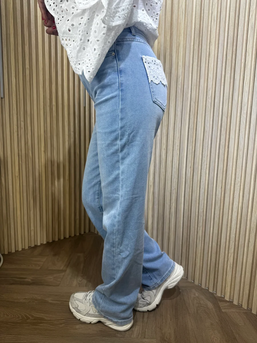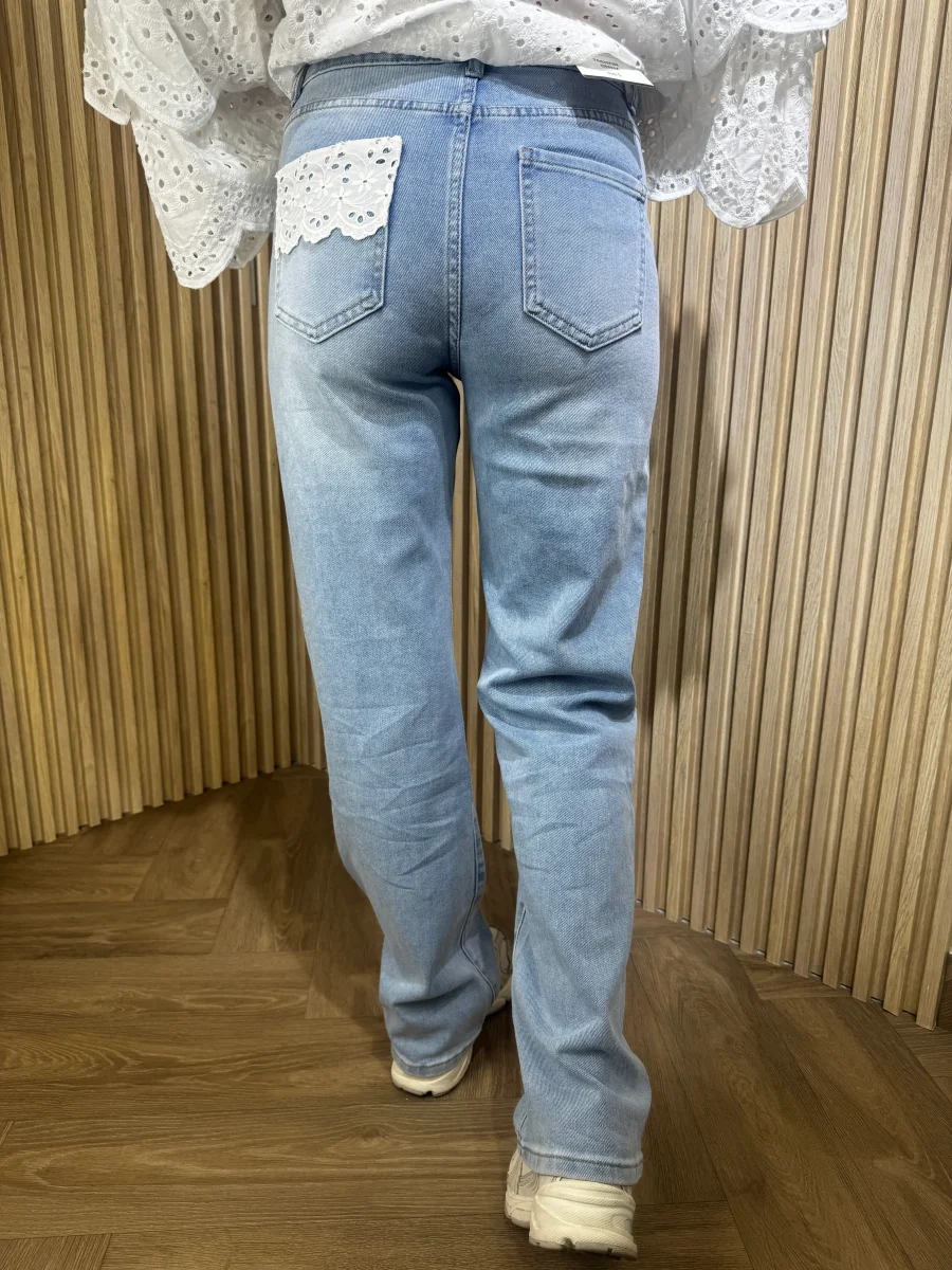 Jeans in tessuto elasticizzato, vita alta con applicazione di pizzo san gallo nella parte posteriore