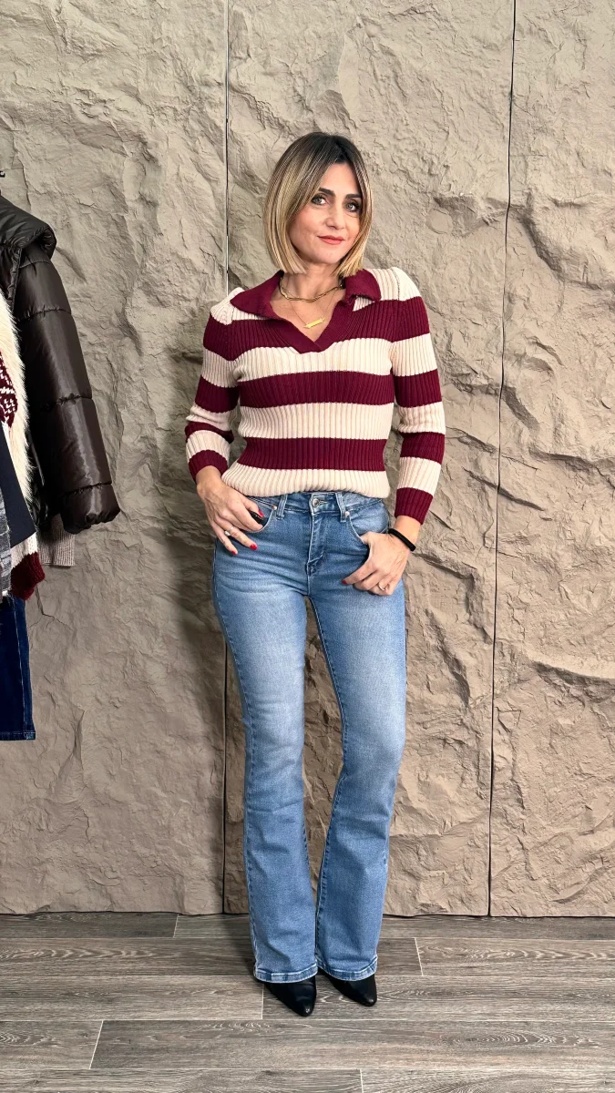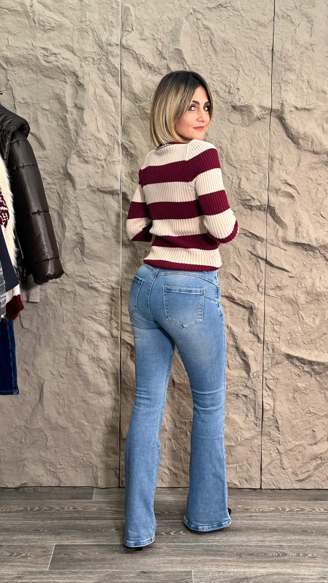 Jeans a zampa che valorizza la tua silhouette con un effetto snellente immediato di -5kg. Realizzato in tessuto elasticizzato che si adatta perfettamente al tuo corpo, offre comfort senza compromessi durante tutta la giornata. Il push up integrato esalta le forme naturali, regalandoti una linea armoniosa e sicura di te. Perfetto per chi desidera sentirsi bella ea proprio agio, in ogni occasione.