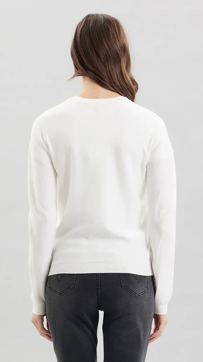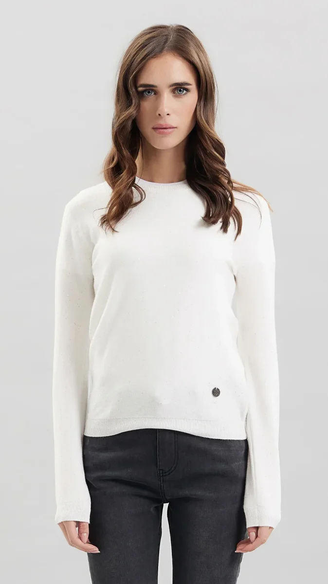 Una maglia morbida e luminosa โquanto bastaโ: il filato รจ impreziosito da micro paillettes tono su tono che regalano un riflesso discreto, elegante sia di giorno che di sera. Spalla leggermente scesa e linea dritta per una vestibilitร comoda e femminile.