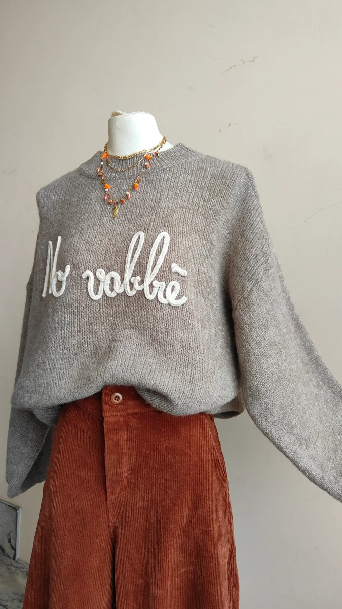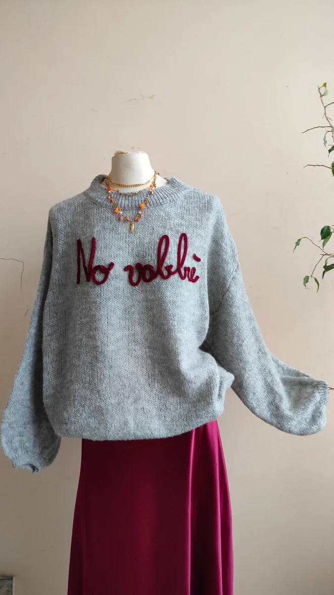 Maglione No vabbè Maglione dal carattere deciso ma dall’anima morbida, impreziosito dalla scritta ricamata in rilievo che diventa il vero punto focale del capo. La vestibilità è confortevole e leggermente over, pensata per essere indossata con naturalezza sia su gonne fluide che su pantaloni o denim. Il filato è caldo ma leggero, con una miscela […]