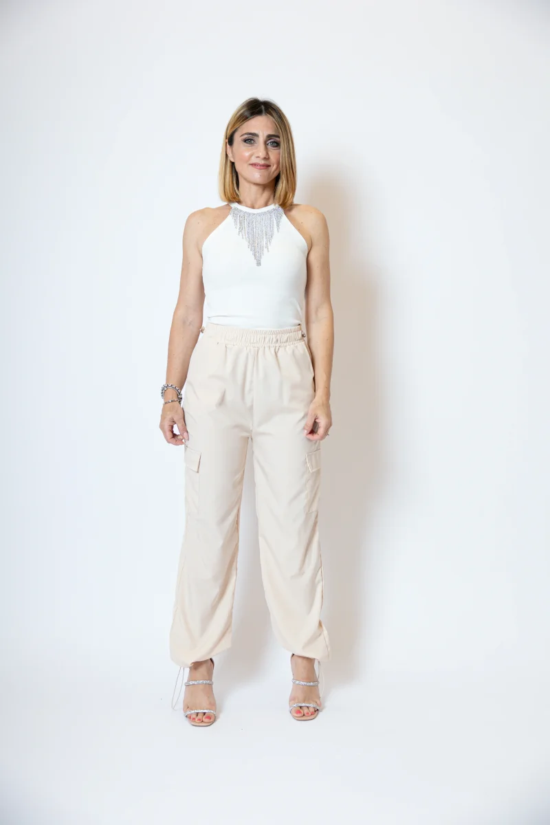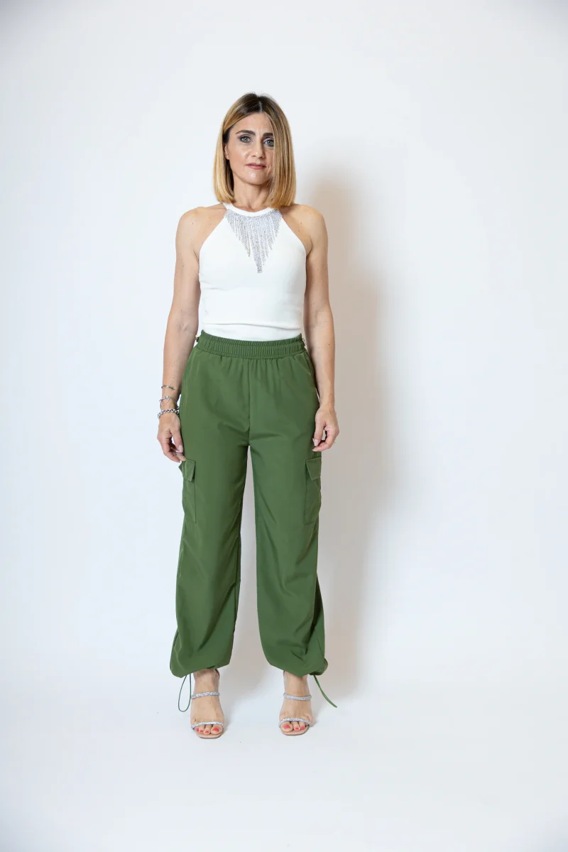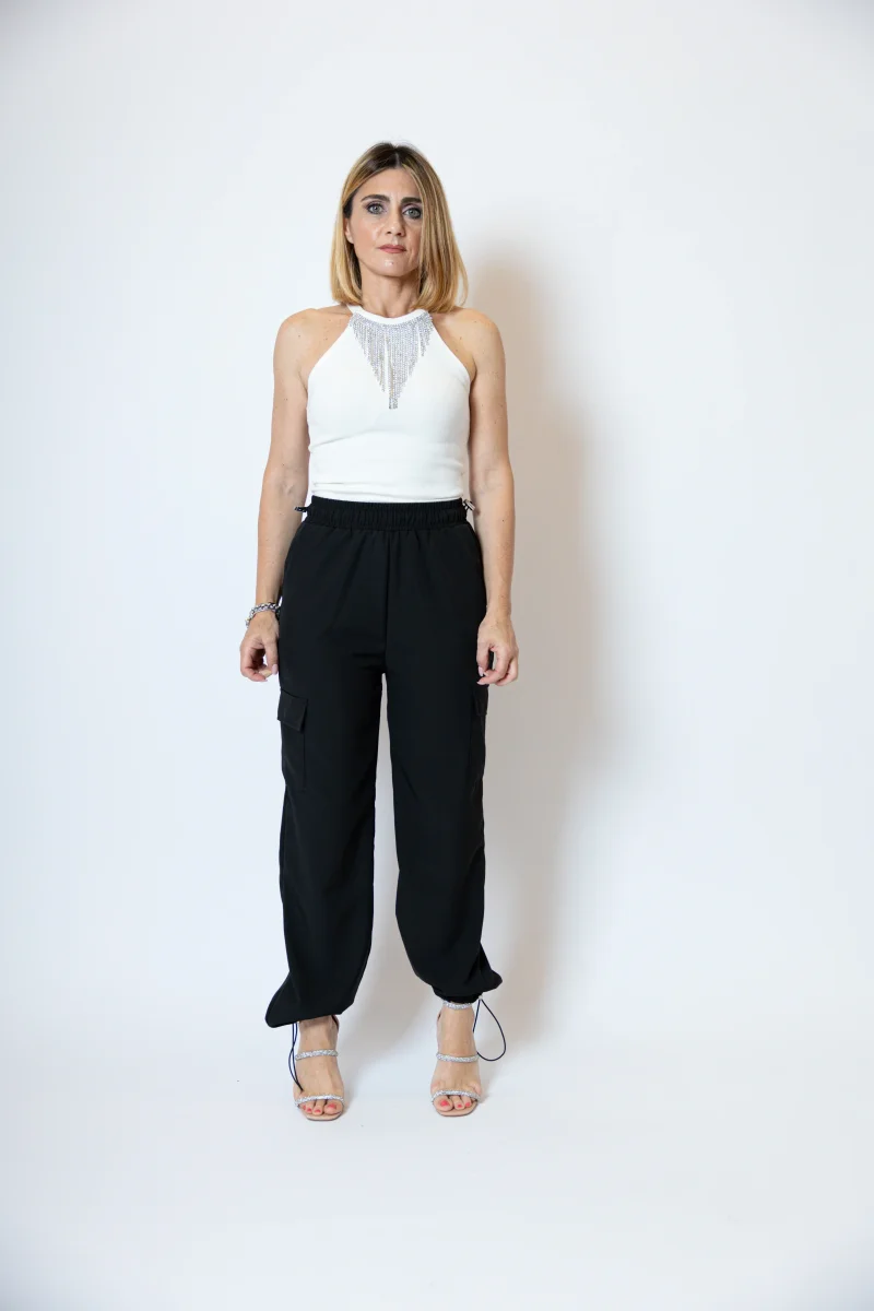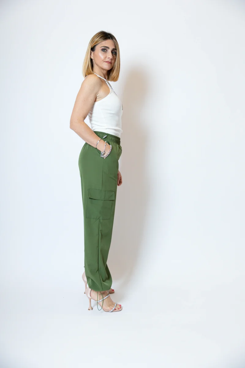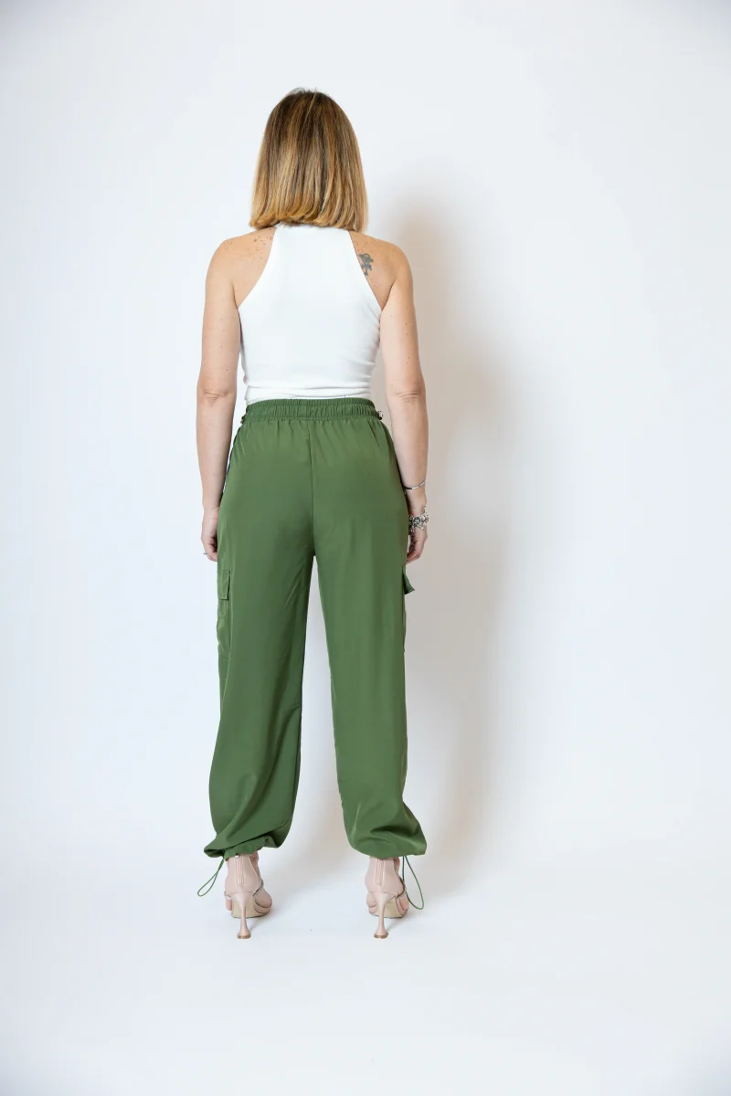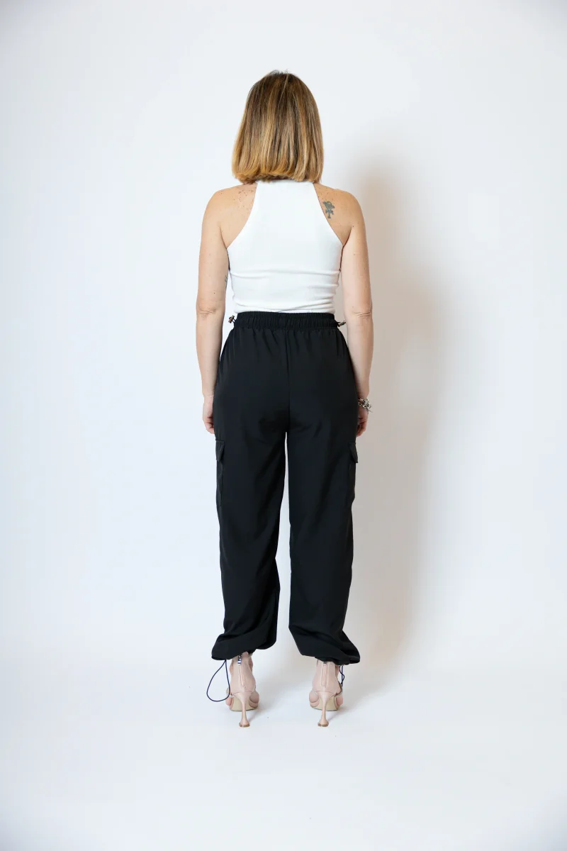 Pantacargo con tasconi laterali, tasche a filetto laterali Alto in vita con elastico regolabile e polsino alla caviglia regolabile. La modella indossa una taglia S/M Composizione: 95% poliestere 5% elastan
