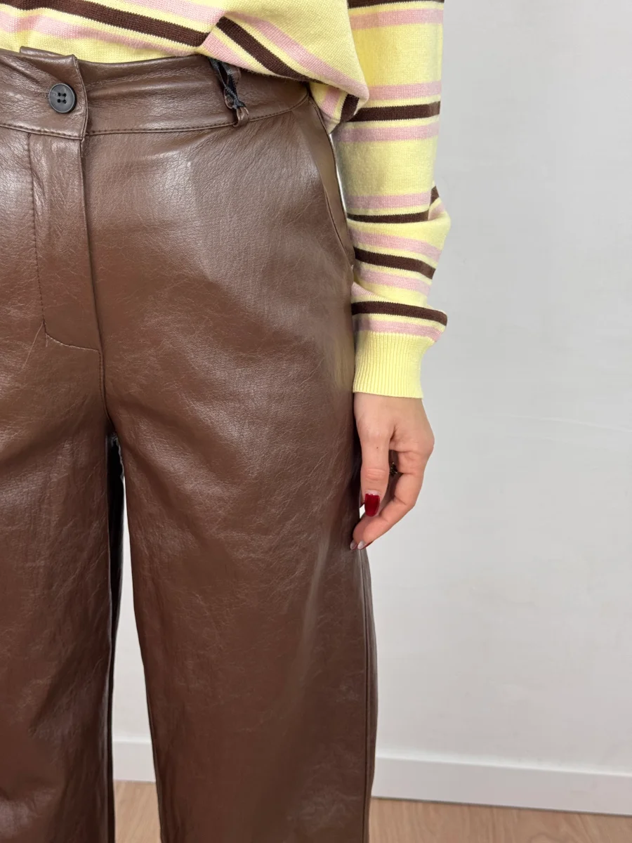 Pantalone palazzo in eco pelle, con bottoncino e cerniera