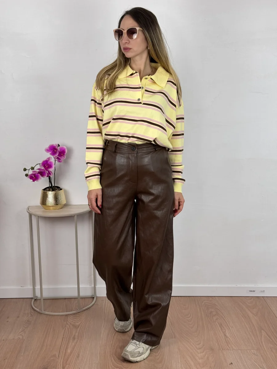 Pantalone palazzo in eco pelle, con bottoncino e cerniera Vestibilitร  regolare, la modella รจ alta 1.65cm e indossa tg.S/M