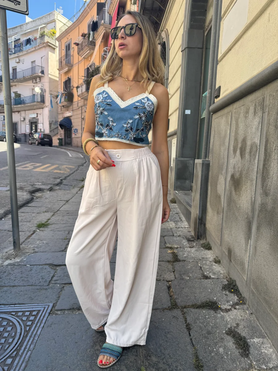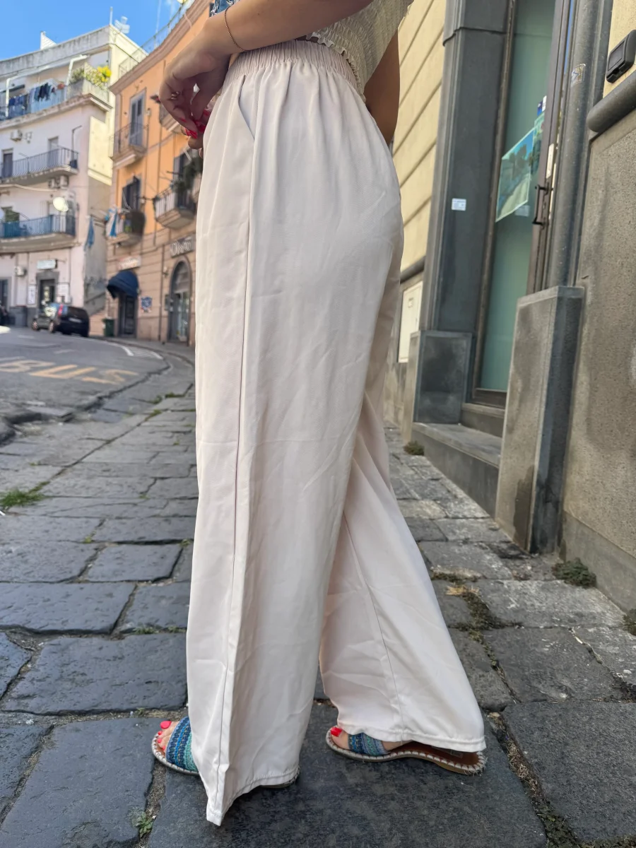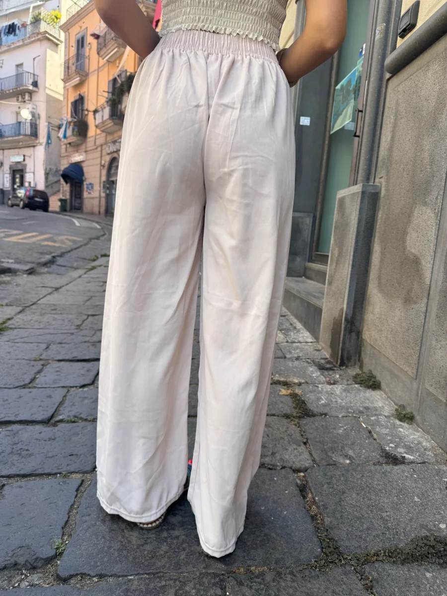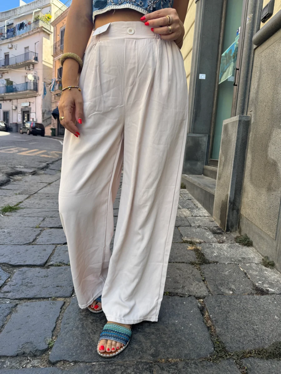 pantalone a palazzo con elastico nel girovita , bottoncino finto