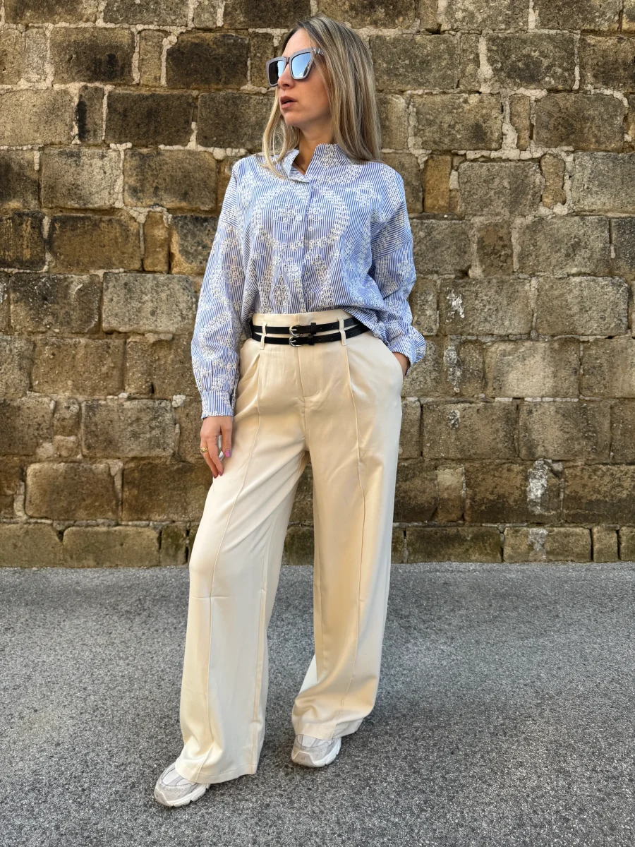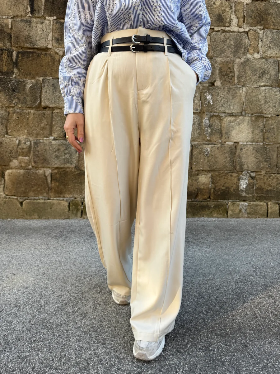 Pantalone a palazzo vita alta con cerniera interna Elastico nel retro ,Cinturino incluso Vestibilitร regolare , la modella รจ alta 1.65cm e indossa tg S/M