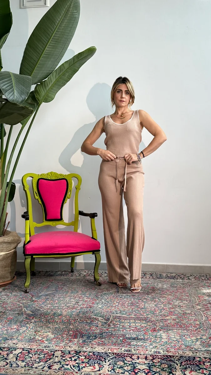 Questi pantaloni Deep sono realizzati in morbida maglia a costine al 100% in viscosa. La banda elastica in vita garantisce una comoditร senza pari. Ideali per un look casual e unico. La modella indossa una taglia unica Misure pantaloni giro vita 108(massima estensione) fianchi 120 (massima estensione) lunghezza pantaloni 110 cmm Composizione 100% viscosa codice […]