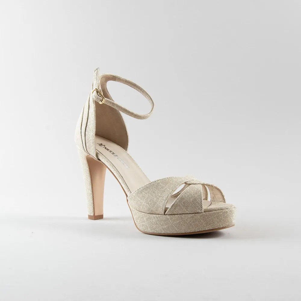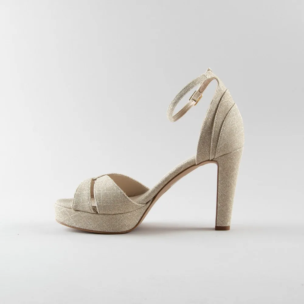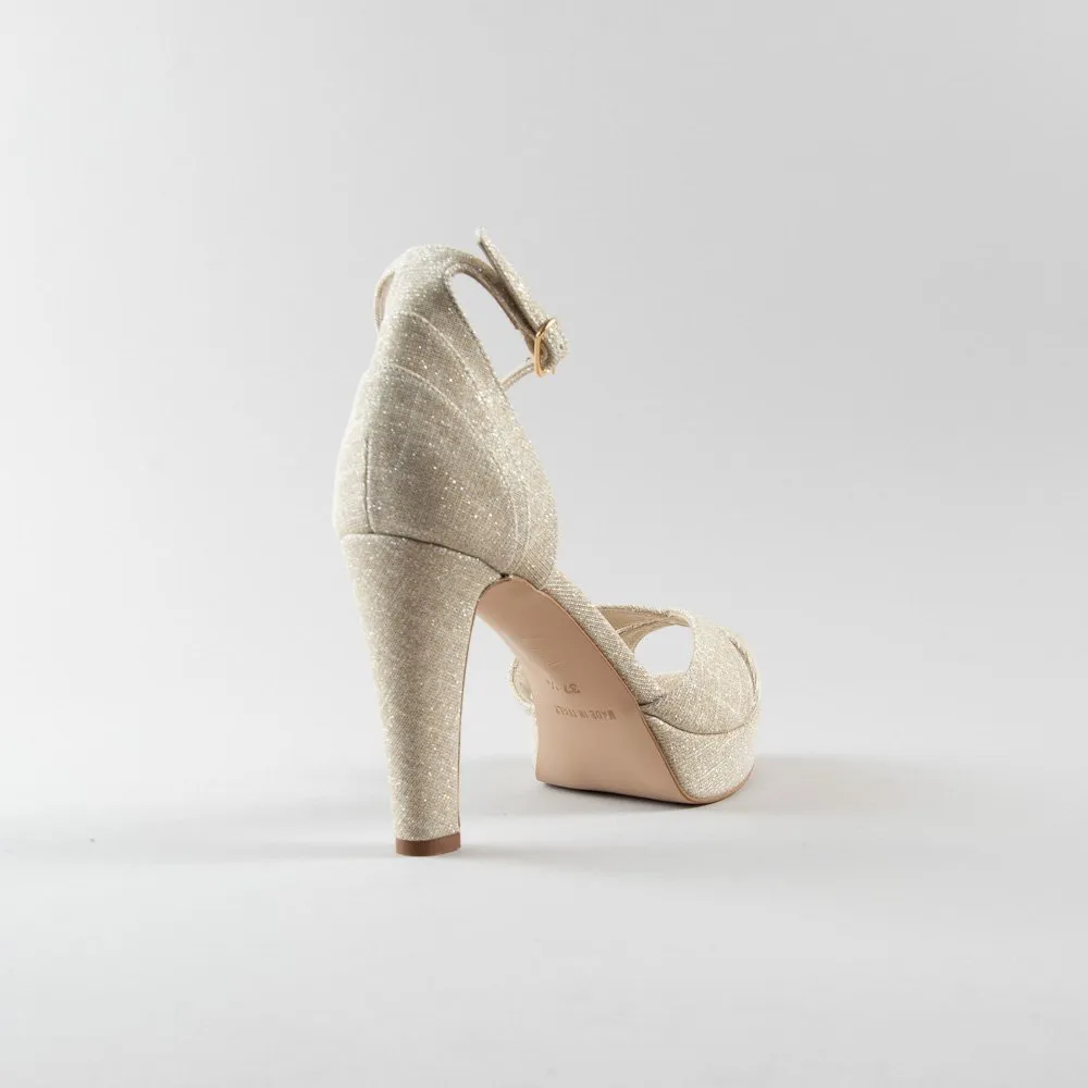 Il Sandalo Deborah di NIKI CORTI รจ la scelta perfetta per chi cerca eleganza e comfort in un’unica soluzione. Realizzati in pregiato tessuto galassia platino, questi sandali presentano un tacco alto di 100mm che, combinato con un plateau di 2,5 cm, offre una silhouette slanciata e raffinata senza compromettere la stabilitร e il comfort.
