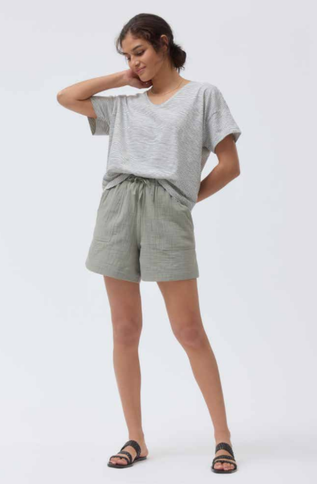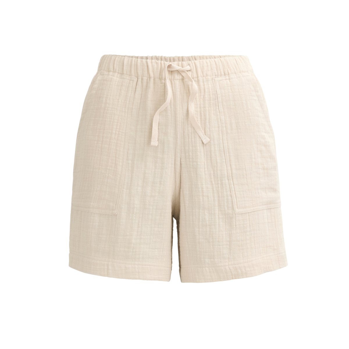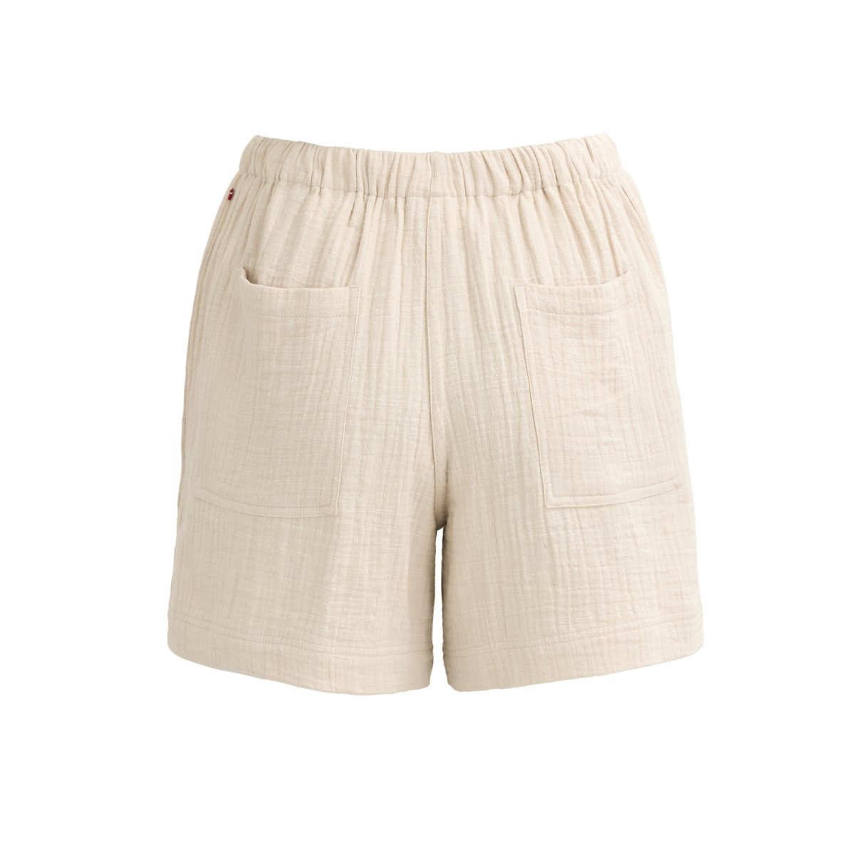 Pantaloncino Shorts donna in morbida mussola di cotone biologico, dalla vestibilitร comoda, con elastico e un pratico laccio a chiusura in vita. Tasche laterali e posteriore. Disponibile nei colori: Sabbia, Khaki