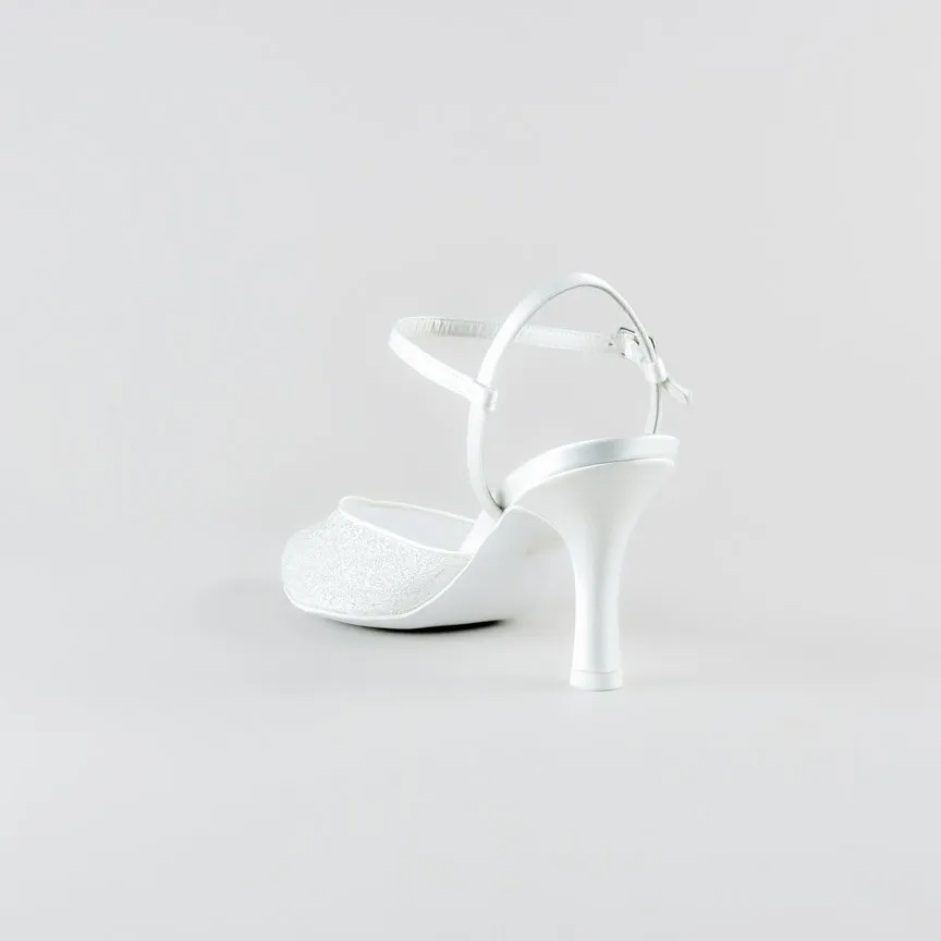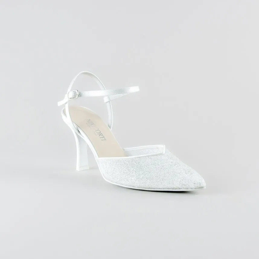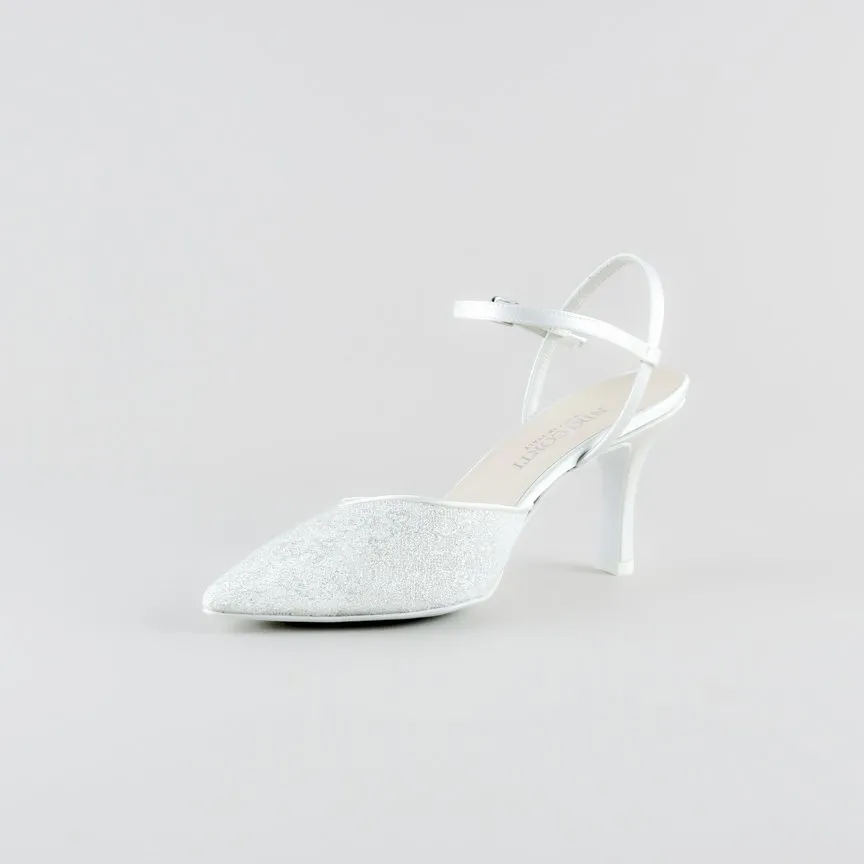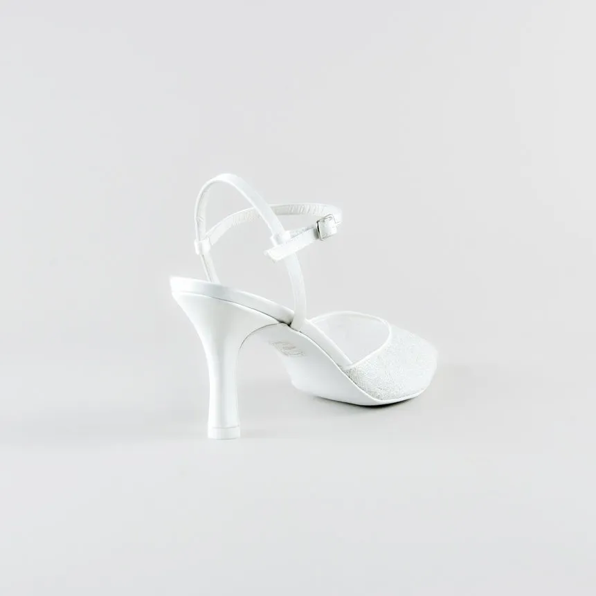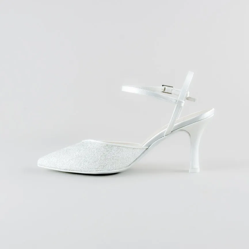Fin dal primo sguardo, questa slingback conquista per lo scollo a cuore, un dettaglio che dona femminilità immediata e slancia otticamente la linea del piede. È un elemento iconico, scelto da molte spose che desiderano una scarpa elegante ma con un tocco distintivo, capace di valorizzare sia abiti minimal sia creazioni più ricche e ricamate.