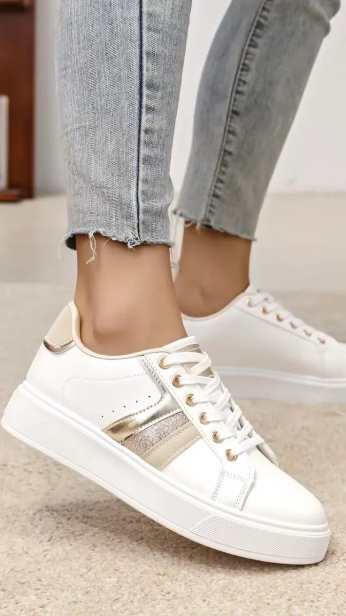 Minimal ma con un tocco prezioso: queste sneakers con suola platform e inserti gold e glitter sono il perfetto equilibrio tra comfort quotidiano e stile femminile. La base bianca pulita si abbina facilmente a ogni outfit, mentre le finiture dorate e brillanti aggiungono luce e personalitร .