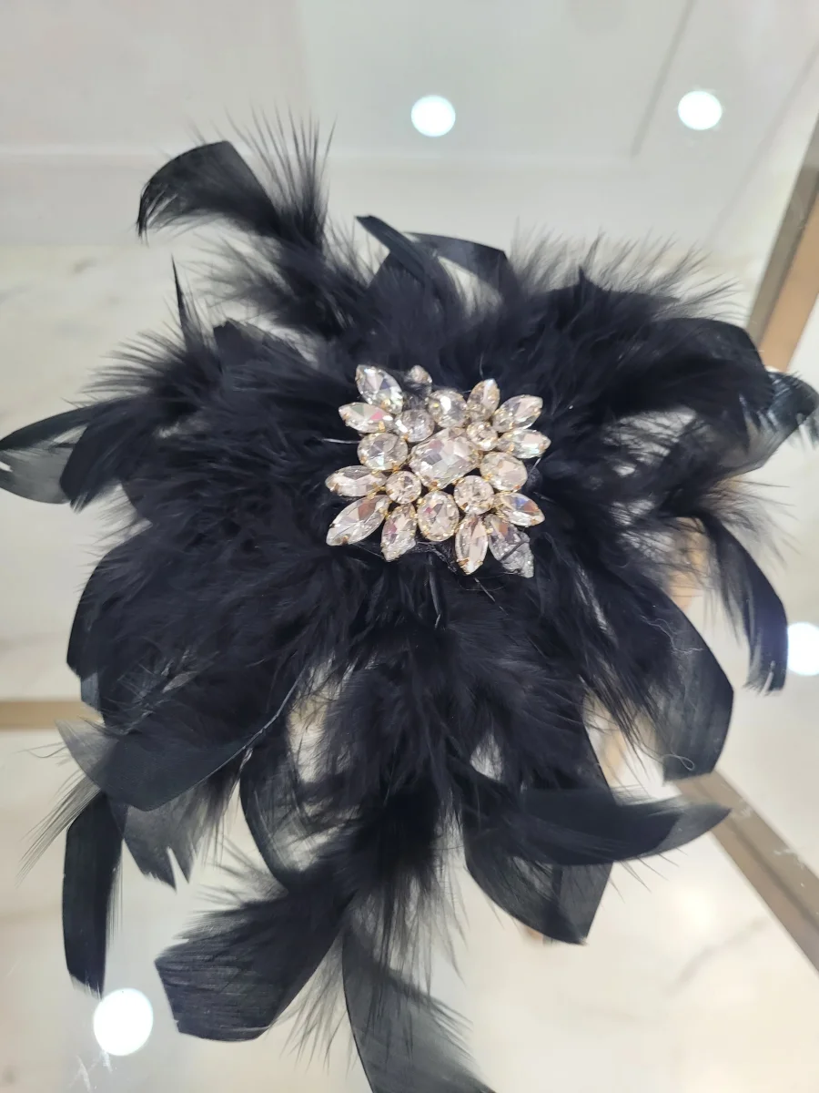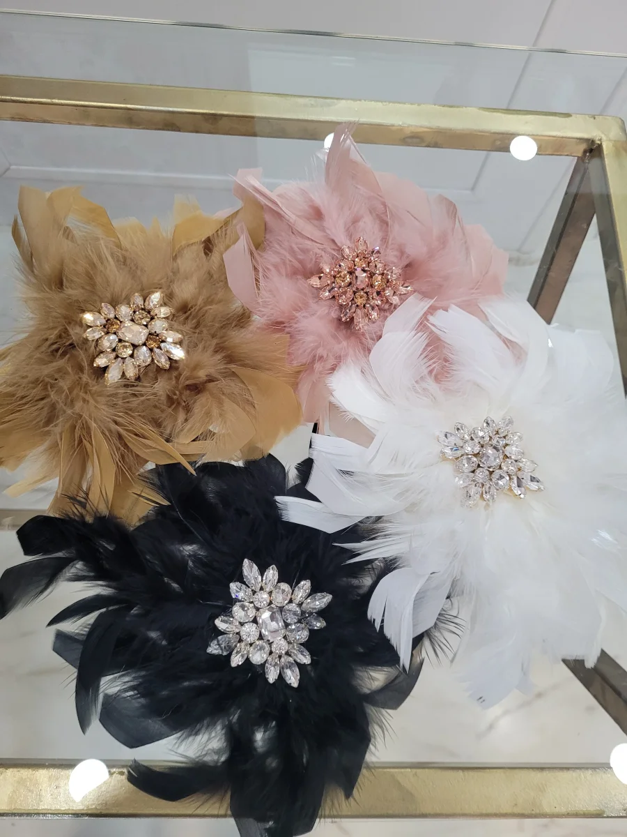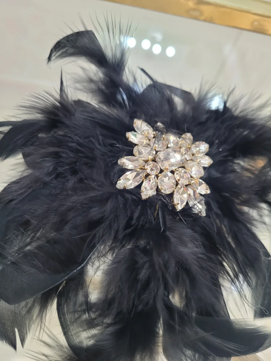 spilla con piume e applicazione di pietre retro con spilla e pinza in acciaio