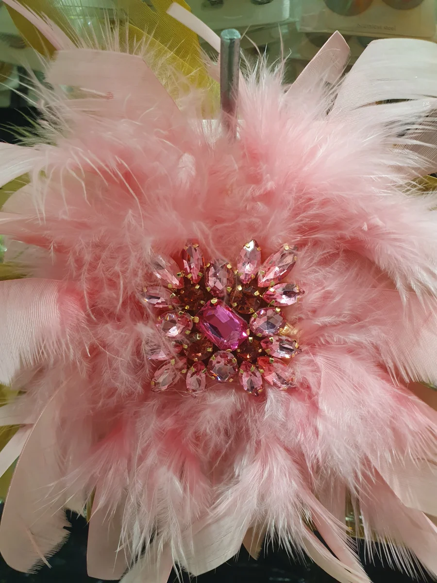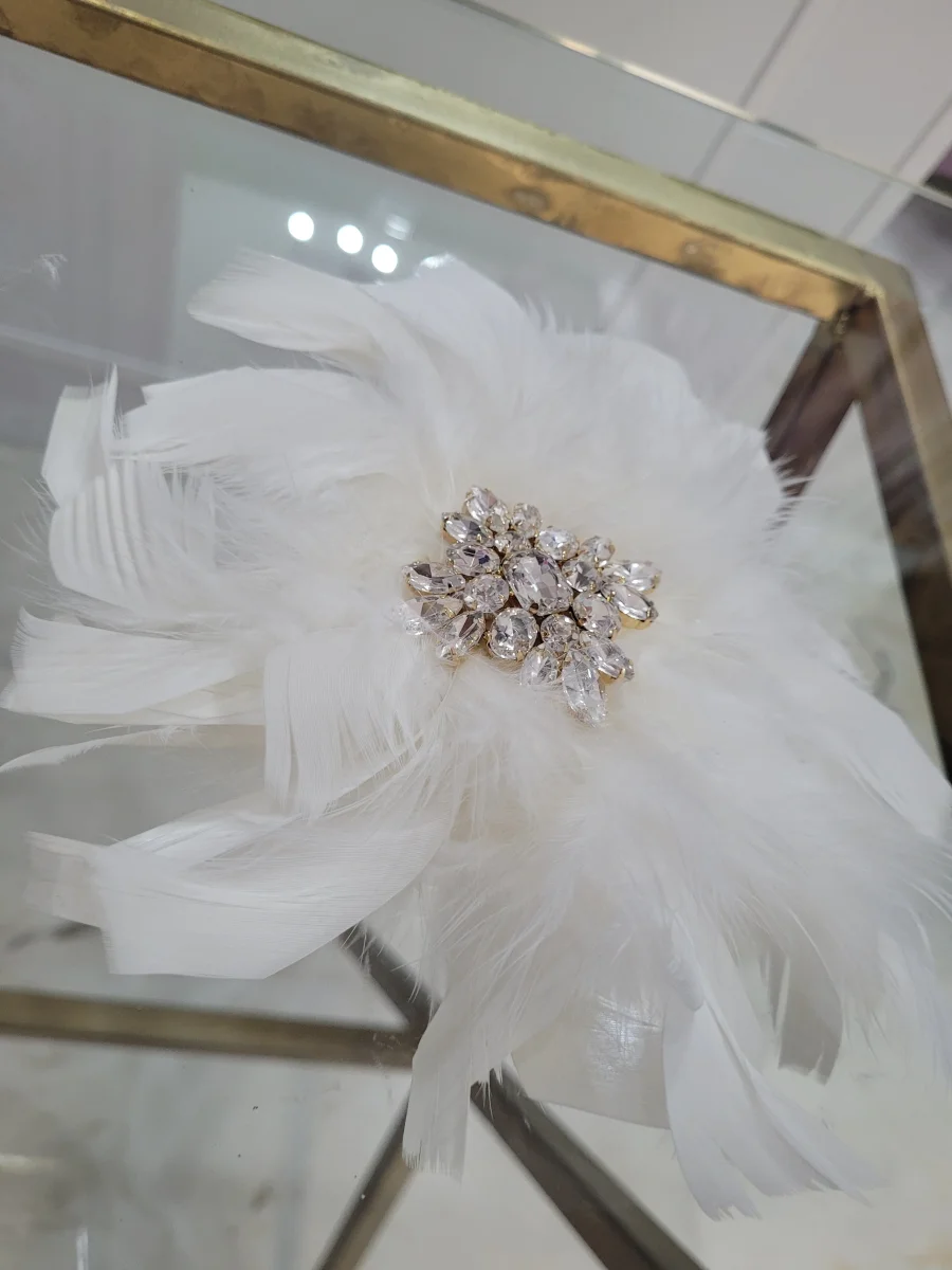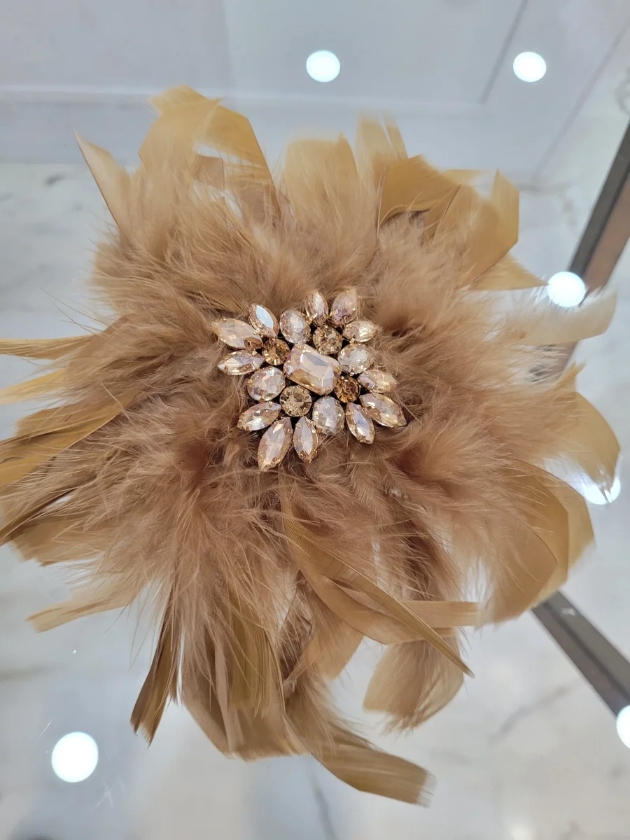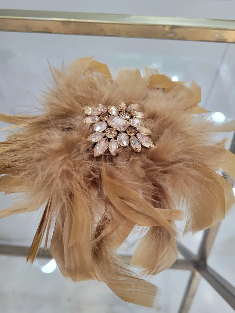 spilla con piume e applicazione di pietre